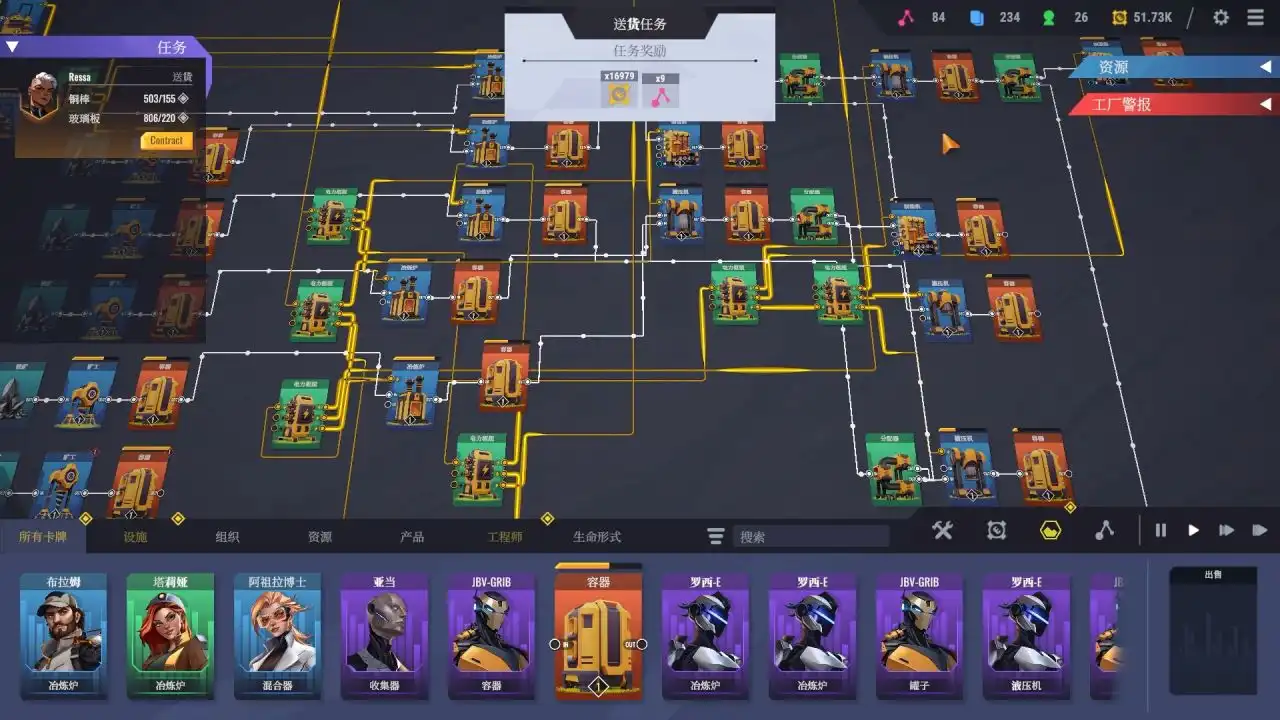 再通过一条条占地空间极小、几乎无放置限制的线路进行连接,材料、产物、液体与电力,都可以通过卡牌上的节点和线路进行联通、流转。
