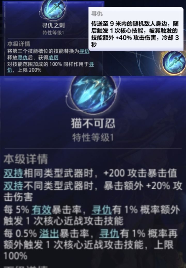 【寻仇之刺】:触发技能,也就是猫3的核心技能是靠特性触发的,这里有个【重点】,核心技能是靠特性技能触发的,不是技能本身攻击触发,也就是说【核心技能⚠️不吃攻速】。