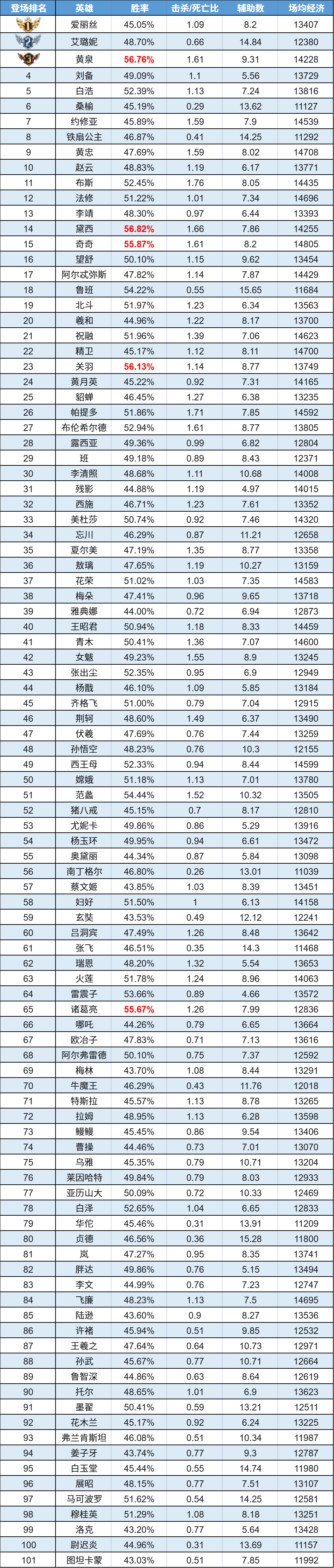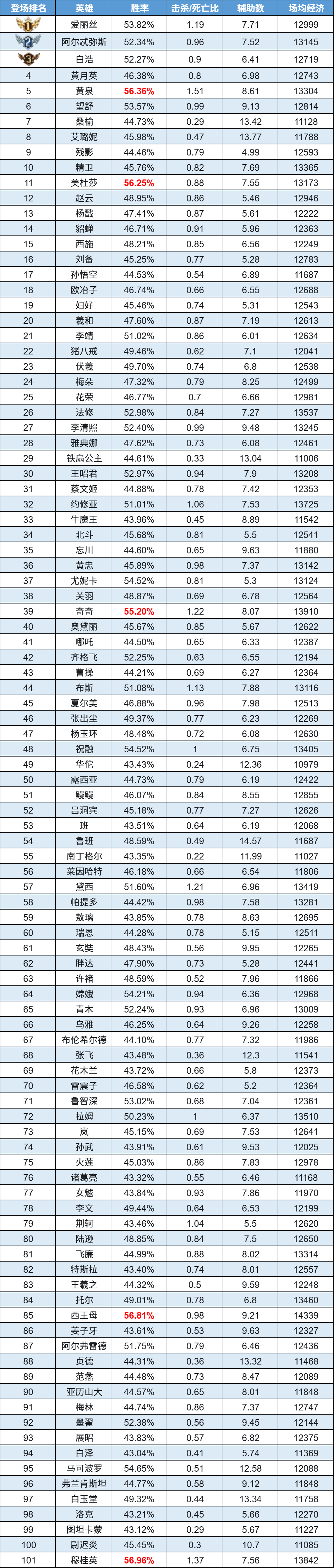 排序:按登场率高低排序,标红为胜率前5