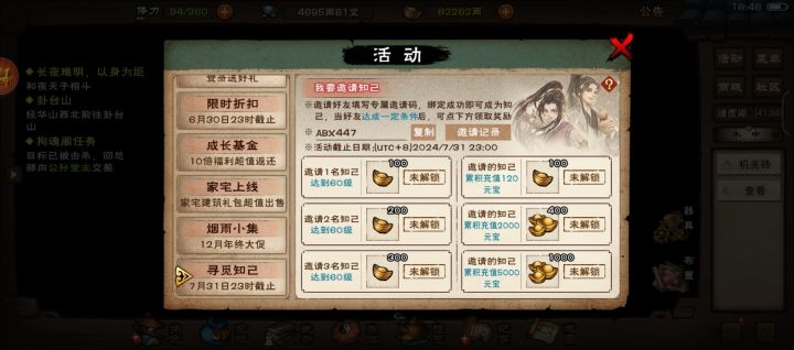 新玩家在游戏右上角点开活动,找到寻觅 知己活动,然后点开我是小虾米,想一起薅羊毛的输入我的邀请码【ABX447】(码字不易,若觉得在下的攻略对您有点帮助,不妨填写我的邀请码~谢谢各位大侠驻足)