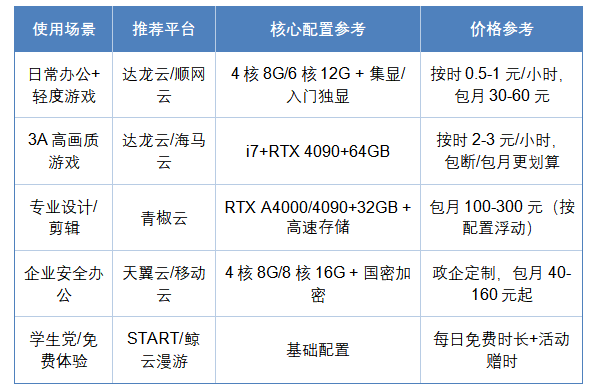 云电脑的核心价值的是“按需分配算力”,选对不选贵,结合自身场景与预算决策,才能最大化发挥其优势。收藏这份指南,按需pick专属云电脑吧!