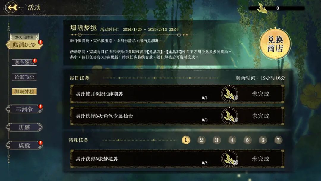 - 珊瑚梦境:活动期间完成赛季机制“梦境”相关任务即可获得活动道具,可在活动商店兑换灵石、彩墨绘卷、画境秘匣等奖励。