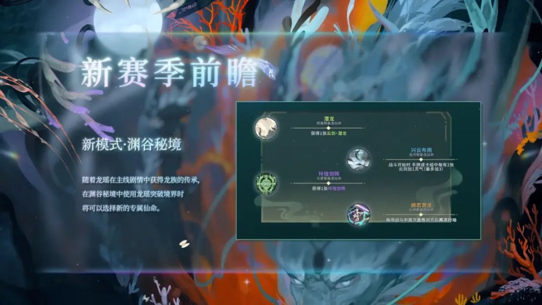在渊谷秘境中,包含了全新的仙命和卡牌。此外每次突破境界时还有机会选到高于当前境界的仙命甚至是其他角色的仙命,过去赛季中的许多卡牌也可能在秘境中出现,带来更多意想不到的构筑可能。