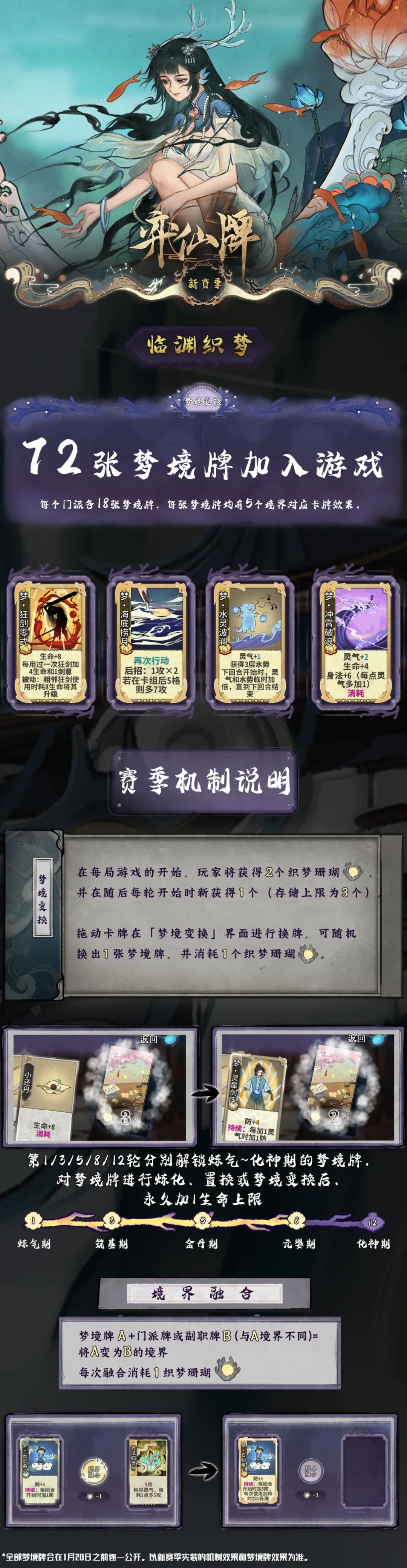 道友们好,《弈仙牌》第九赛季「临渊织梦」将会在1月20日11点正式开启!带来全新赛季机制「梦境」、全新单人肉鸽爬塔模式「渊谷秘境」、逸品衣着「龙瑶-御九霄」、主线剧情第八章等内容。