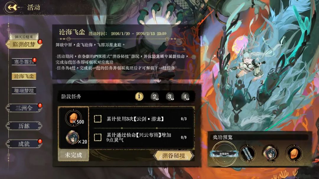- 沧海飞尘:活动期间游玩“渊谷秘境“并完成任务,即可获得灵石、彩墨绘卷、尊号等奖励。