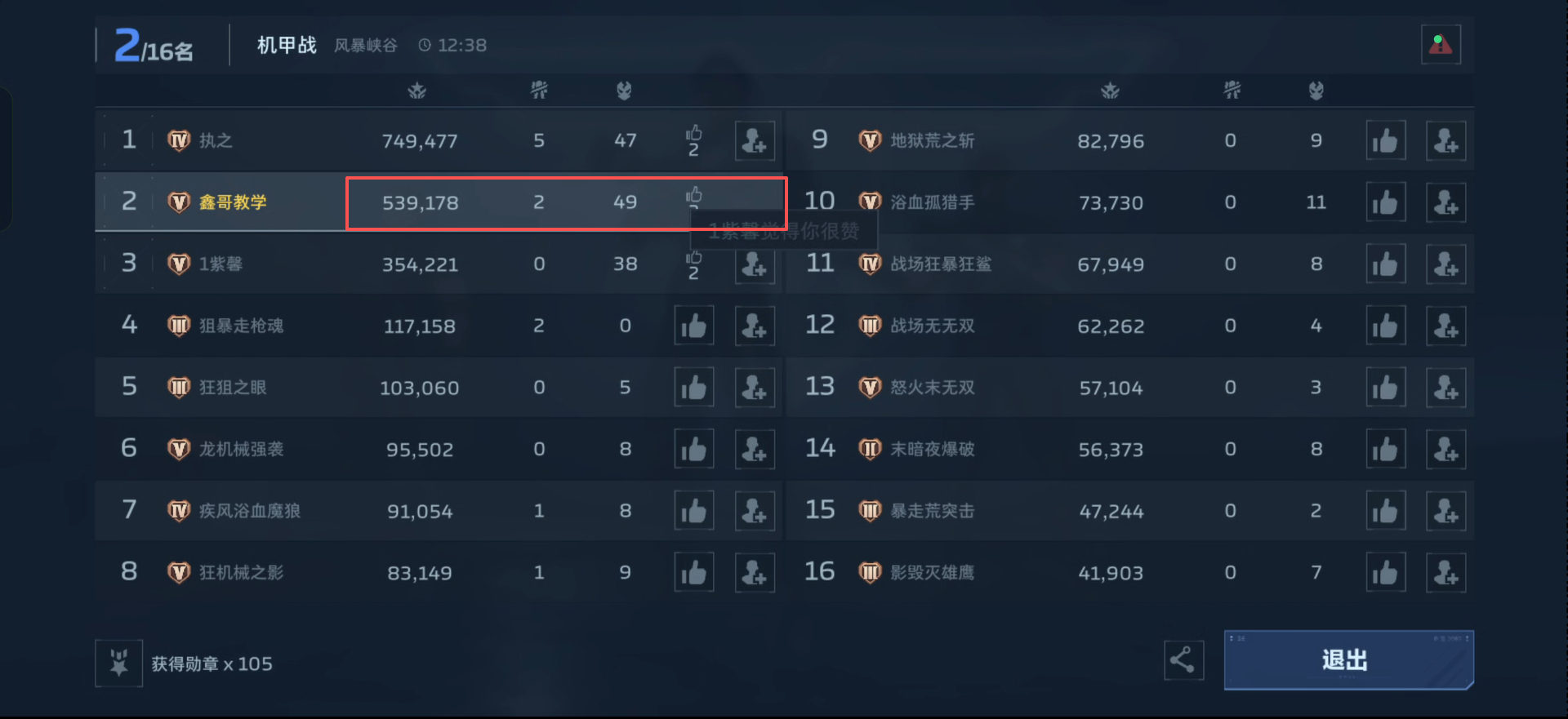 - 我的伤害是539,178,距离第一名仅差 21 万,主要是后期机甲残血时我换弹慢了一步。