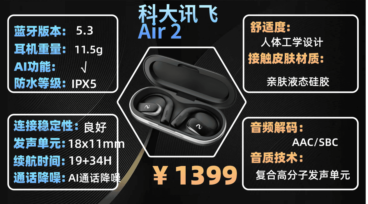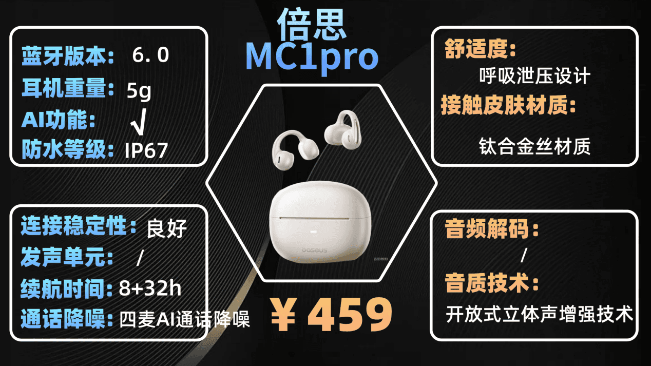 单耳才7克出头,之前的耳机戴半小时就压得耳朵疼,这个完全不会。C形记忆钢丝耳挂特贴耳,跑步跳操甩头都稳,戴眼镜也不硌,但小耳星人初次戴可能有点坠,适应两天就好。音质挺惊喜,第十代振子让人声特清晰,听播客像面对面聊,低频也够劲,流行歌氛围感拉满。就是声场偏窄,复杂乐曲里乐器声有点混,不过日常用绝对够。