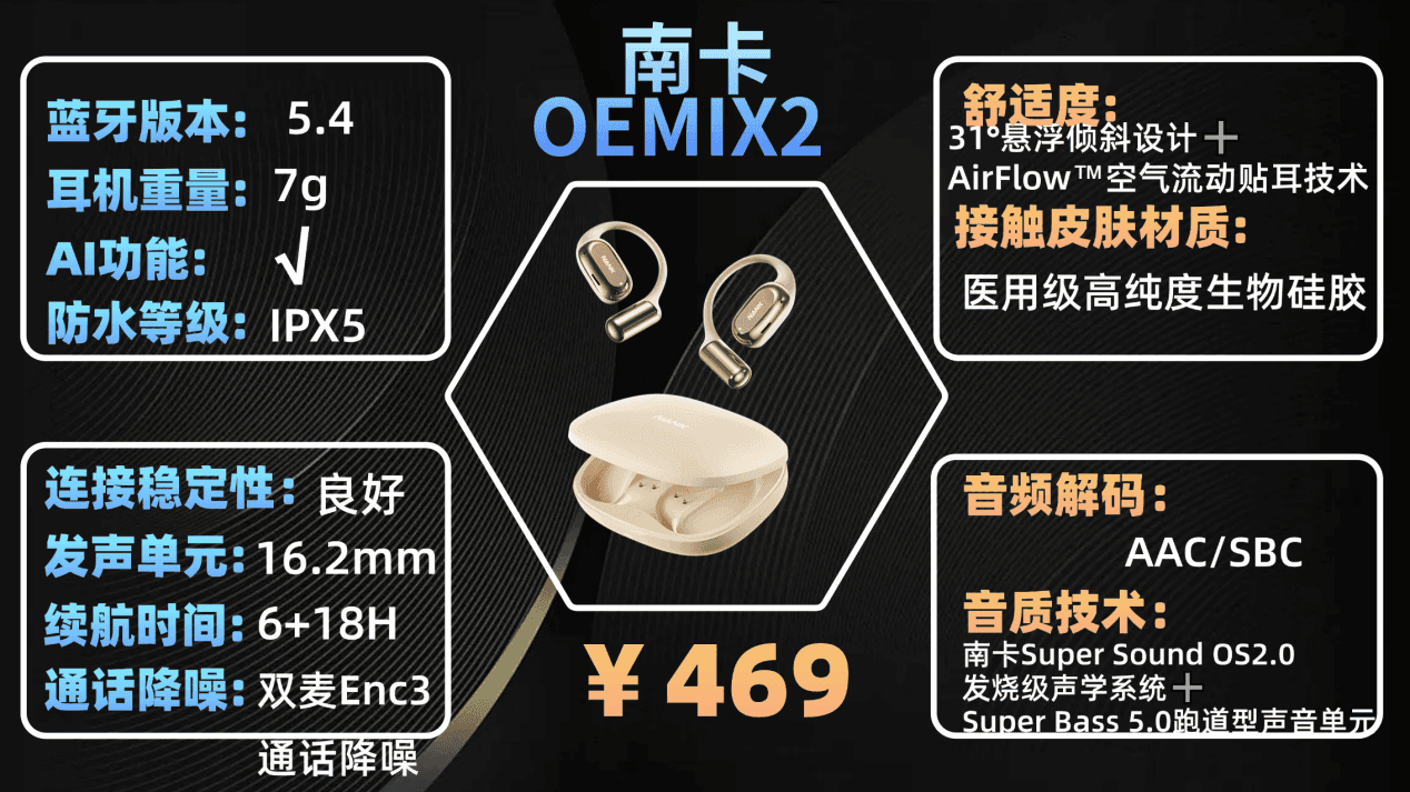 打造了Super Bass 5.0高性能声学单元、6+3维传感空间音频,搭配Super Sound OS 2.0声学系统,通过软硬件结合的方式,让声波保真度高达99.9%!真正把开放式耳机的声音,做到了Hifi耳机的水准。也因此南卡开放式耳机品质、性能极其强悍,业内罕见!南卡OE Mix2耳机单耳仅7克,其高集成精密结构打造了更小巧的身型。整机框架选用航空级超弹记忆钛合金,结合医用级高纯度生物硅胶材料,能够自适应贴合不同耳型,并且经过严格的安全性测试,符合人体工程学和生物兼容性要求,亲肤感十足,细腻如丝,佩戴时享受全天候的舒适聆听。而且为了适应国人的耳廓结构,南卡OE Mix2搭载的EAA 2.0悬停舒适技术,是基于10W+国人数据,精确分析国人耳道特征进行调校,实现了惊人的99.9%佩戴适配度,简直就是耳朵的贴身定制!不仅如此,南卡还顾及到了戴眼镜用户,兼容性高达100%!再也不用担心与眼镜的冲突了!不论是跑步、锻炼还是日常生活,都能享受到无压力的佩戴体验。