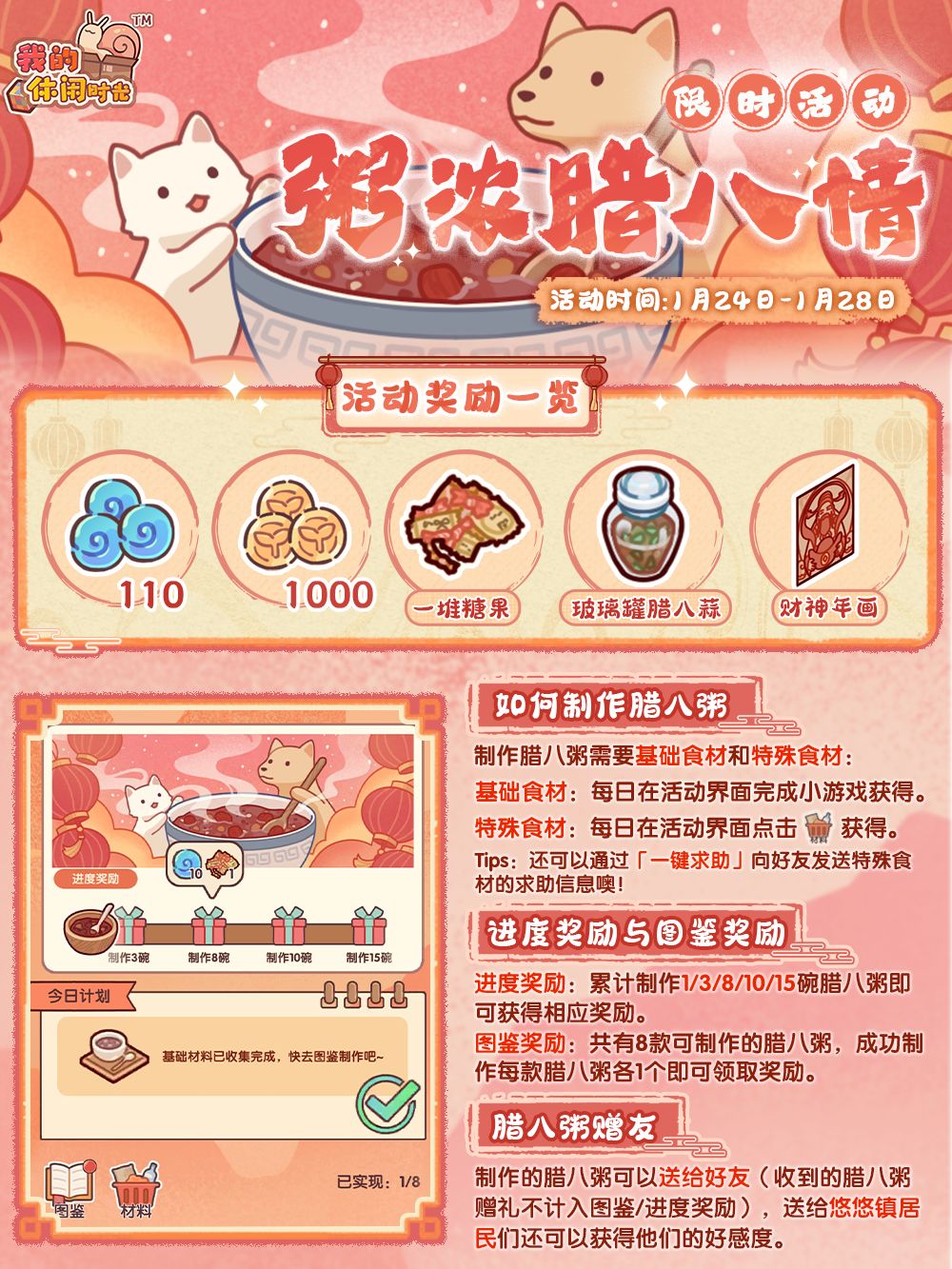 活动期间,小蜗可以在活动界面领取每日材料(内含特殊食材*10),同时完成每日小游戏收集足够数量的基础食材后,即可在「图鉴」中制作相应的腊八粥,制作的腊八粥数量达指定目标后可领取限定家具、服饰奖励,成功制作出图鉴中的所有腊八粥还可领取图鉴奖励哟!