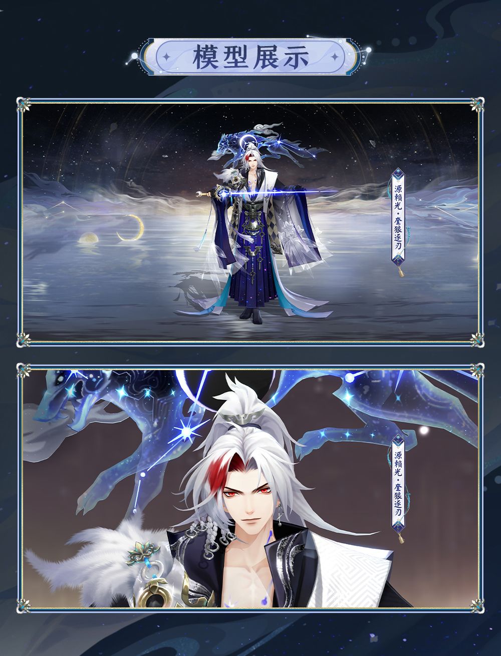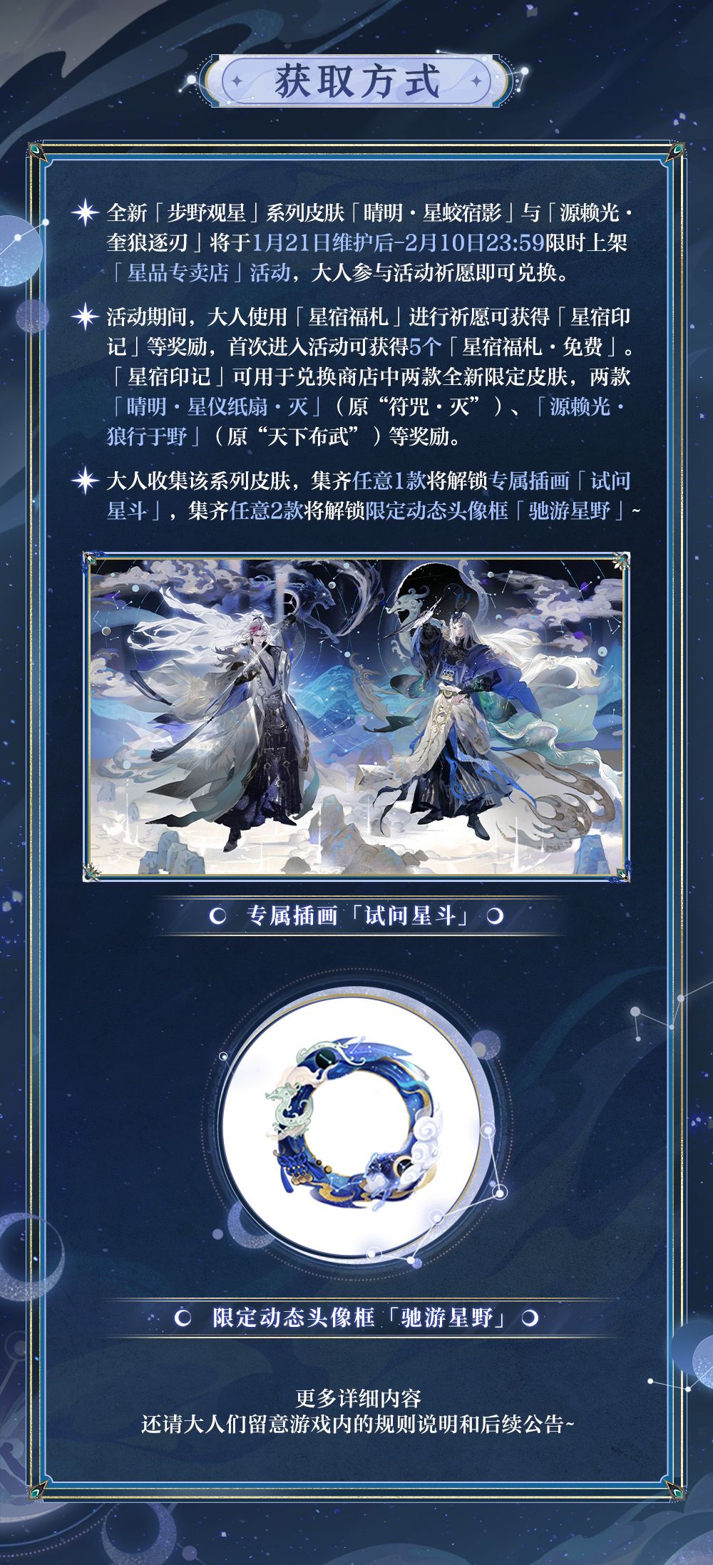 △全新「步野观星」系列皮肤「晴明·星蛟宿影」、「源赖光·奎狼逐刃」将于1月21日维护后-2月10日23:59限时上架「星品专卖店」活动,大人参与活动祈愿即可兑换两款限定皮肤,两款全新姿度「晴明·星仪纸扇·灭」(原“符咒·灭”)、「源赖光·狼行于野」(原“天下布武”)等奖励。