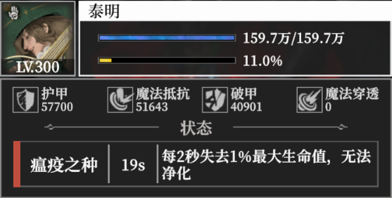 开场时对最近的英雄附加1层瘟疫之种,每2秒失去1%最大生命值,持续20秒。英雄释放能量技后,将瘟疫之种传播给最近1名单位并叠加2层瘟疫之种,上限7层,无法净化。