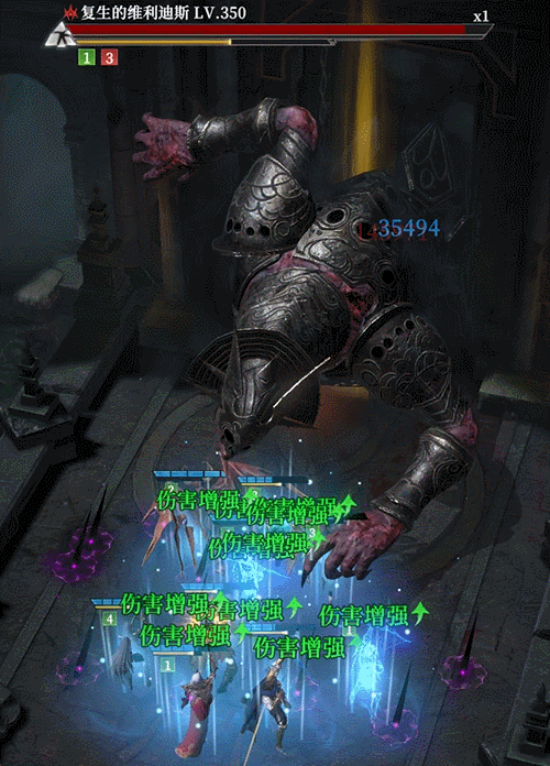 在大概剩余时间1:30的时候,双恶魔就绪,就可以连续使用灾厄之祭抽取狂想旋律的血量,触发被动咒骂对Boos进行能量衰减,并且在这之后继续用完剩余两个闪电瓶,即使Boss触发霸体也不给它释放能量技的机会,全队安全通过第一阶段。
