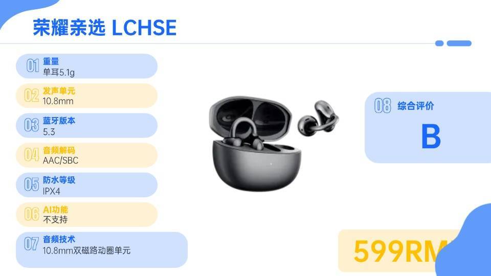 其他方面:声阔AeroFit 搭配BassUp 低音增强技术,通过模拟空气自然流动的态势,让声音更加出彩动听。同时具备3D环绕立体声,定向聚声技术,精准高效传声,提高通话私密性。 支持蓝牙5.3版本,设备连接快速、高效,日常使用场景下延迟控制得当,而且能够与大部分设备兼容。续航方面,单耳最高续航11h,搭配充电仓使用达到42h超长续航,同时搭配能量闪充技术。开放式耳机推荐八: 荣 耀亲选 LCHSE参考价格:599元推荐指数:⭐⭐⭐推荐理由:续航能力出色,声音空间感强核心优势:单耳仅5.1g,钛合金拱桥结构搭配人体工学设计,久戴无压且运动时稳固不掉,IP54 防尘防水适配多场景;10.8mm 双磁路动圈单元+PEEK+PEN镀钛振膜,配合动态低音增强与定向传音技术,漏音更少,高频通透、低频有力,双麦 AI 降噪保障嘈杂环境通话清晰;蓝牙5.3连接稳定,单次续航7小时、总续航36小时,10分钟快充可听歌2 小时,支持双设备连接。