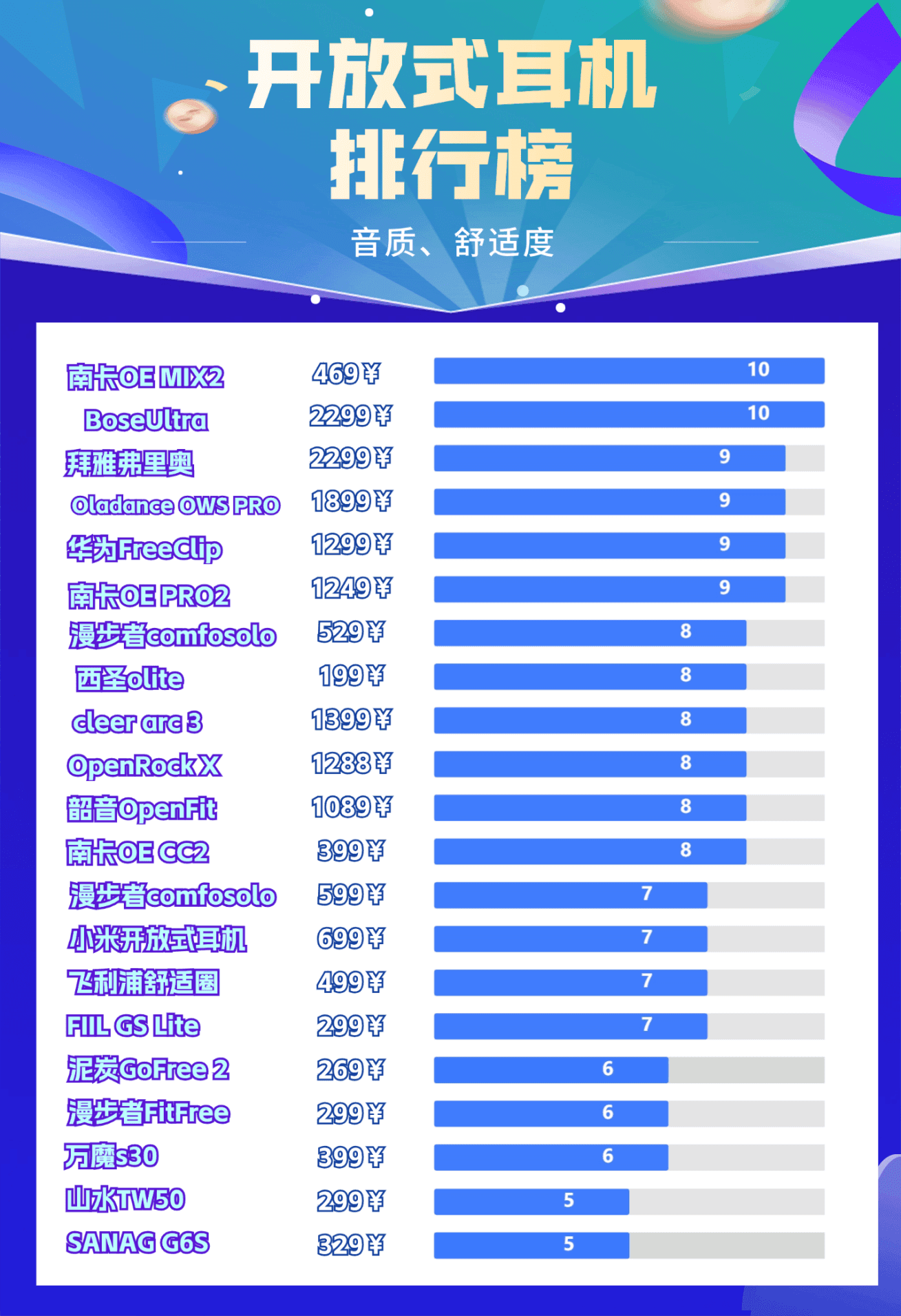 开放式耳机推荐一:南卡OE Mix2参考价格:469元推荐指数:⭐⭐⭐⭐⭐推荐理由:百元性价比标杆,性能不输千元专业级耳机核心优势:作为业内公认少数始终坚守匠心精神的专业团队,南卡凭借十余年在开放式音频研发技术的深耕,被广泛认为是该领域技术积淀最深、专业度最高的品牌之一,其工艺水平在行业内稳居第一梯队。不仅获得了专业机构的认证,在用户群体的口碑也是非常能打。这款OE Mix2搭载了Super Bass 5.0跑道型高性能声音单元、OS 2.0发烧级声学系统、6+3维传感空间音频、高定制蓝牙5.4芯片SOC等远超同价位竞品的配置,遥遥领先。