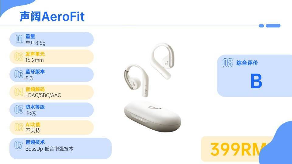 其他方面:小米开放式耳机Pro搭配1813超大动圈声音单元,同时采用高分子复合振膜+内外双磁设计,让低音表达更加出色。升级LHDC5.0,做到音质无损输出的同时真实还原声音细节。此外,小米自研调音模式,提供更加多种曼妙的音感,搭载的独立防漏音系统,提升听音隐私性。支持蓝牙5.4版本,支持独立录音和AI实时翻译的功能,让办公更加便利,对于小米生态用户会比较友好。续航方面也很不错,单体耳机续航长达8.5h,搭配充电盒续航可达45h开放式耳机推荐七:声 阔AeroFit参考价格:399元推荐指数:⭐⭐⭐推荐理由:云感轻盈佩戴,低音增强增强技术保持澎湃音感核心优势:气传导不入耳耳机,云感佩戴更舒适,单只耳机重量约为8.5g,人体工学仿真设计,牢牢贴合不同耳廓。搭载BassUp 低音增强技术,模拟空气自然流动的态势,气旋澎湃音质,让声音更动听。满足大部分蓝牙设备连接,同时也搭配闪充技术,续航能力出色。