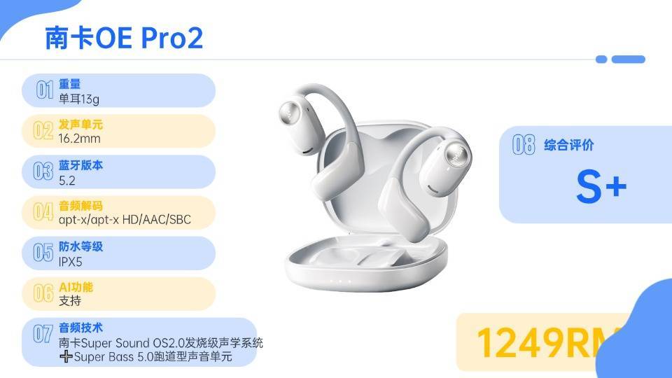 其他方面:音质方面配备C leer DBE4.0低音增强技术+Xtensa HIFI 4高性能音频处理单元,提升对音频的动态调节,增强低频下潜能力,实现对低频声波的精准控制。同时搭载全新的高通骁龙S3音频平台,双麦克风降噪带来清晰的语音通话。搭载蓝牙5.4版本,做到信息传递更快、更保真。AI体感操纵2.0版本捕捉用户动作,让用户在忙碌时也能解放双手。续航方面,单次续航9h,配合充电仓可达36h,同时支持闪充模式。开放式耳机推荐四:南卡OE Pro2参考价格:1249元推荐指数:⭐⭐⭐⭐⭐推荐理由:主打“舒适和音质”性能的开放式耳机,业内TOP1口碑爆品核心优势:南卡在开放式耳机领域的口碑与影响力已稳居行业顶尖,OE Pro2无论音质体验上还是ai体验上,都被公认为当前开放式耳机的Top1代表。它通过“软硬件协同”的独特设计理念,将智慧Ai与音质兼得,并依托南卡13年的声学技术沉淀,彻底突破了开放式耳机普遍存在的音质单薄、漏音严重等行业痛点。与此同时,OE Pro2还整合了全能AI智慧助手,能够满足翻译、对话、搜索、写作、创作等多样化场景需求。也正因如此,它不仅赢得了HiFi发烧友与运动达人的一致好评,更在开放式耳机圈内长期稳居第一梯队。