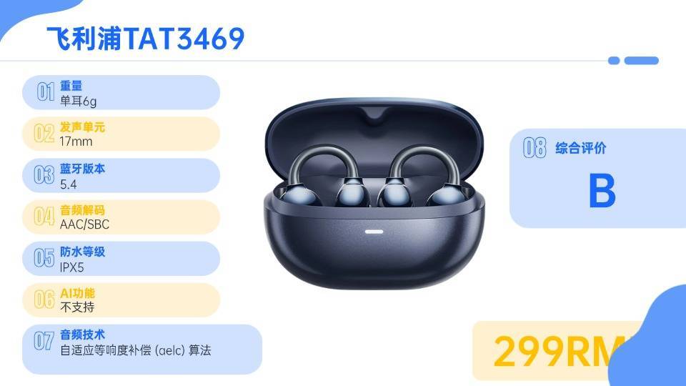 其他方面:音质方面采用BoCo骨传导振子Accurate Verticle Vibration技术,采用AVV技术实现高稳定、高弹性的垂直均匀震动,有效抑制漏音。同时高版本cVc8.0降噪技术+通话麦克风,有效消除噪音,实现清晰保真的通话效果。配置方面,骨聆SS900支持蓝牙5.2,搭配高通QCC3040强芯加持,实现高容量、高速度、长距离的三大提升,更远更快更稳定。续航方面,单次使用8h,搭配耳机仓总续航约24h,续航方面相较于其他耳机较弱,同时支持快充10分钟,续航2h。开放式耳机推荐十:飞 利浦TAT3469参考价格:299元推荐指数:⭐⭐⭐推荐理由:佩戴轻盈舒适,续航出色核心优势:3D人体工学设计带来的超轻无感佩戴体验,稳固防掉且久戴不压迫,同时搭载蓝牙5.4 保障连接稳定,AI通话降噪技术让嘈杂环境下沟通清晰,配合单次7.5小时、总续航可达38小时的长续航能力及5分钟闪充功能,再加上IPX5防水防汗、定向传音减少漏音的特性,兼顾了实用性与安全性,音质上高低音均衡耐听