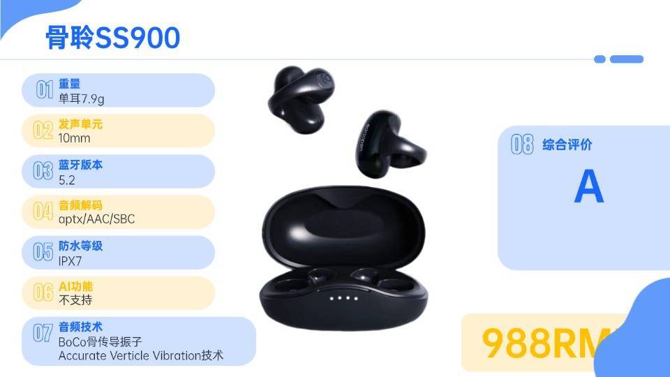 其他方面:音质方面,荣耀亲选 LCHSE配备10.8mm双磁路动圈,动态低音增强和空间环绕声技术,让声音更有方向感和临场感,搭配PEEK+PEN镀钛振膜,降低声音失真和加强低音的表达,做到高音不刺耳,低音动感细腻。同时AI通话降噪,两只高灵敏度麦克风配合AI多通道深度神经网络通话降噪算法,过滤环境噪音,保证通话顺利进行。配置方面,荣耀亲选 LCHSE支持蓝牙5.3,双设备连接,实现双设备连接,切换自如。更有单次续航8h,配备充电仓36h长续航。开放式耳机推荐九:骨 聆SS900参考价格:988元推荐指数:⭐⭐⭐推荐理由:弹性夹持弯臂佩戴舒适,防漏音效果明显核心优势:搭载自研振子与PreciseAir 3.0技术,在保证开放双耳、零耳道压迫的前提下,显著优化了低频表现并抑制漏音。它通过弹性夹持结构实现稳固佩戴,单只耳机重量7.9g,日常长时间佩戴基本没有什么问题。