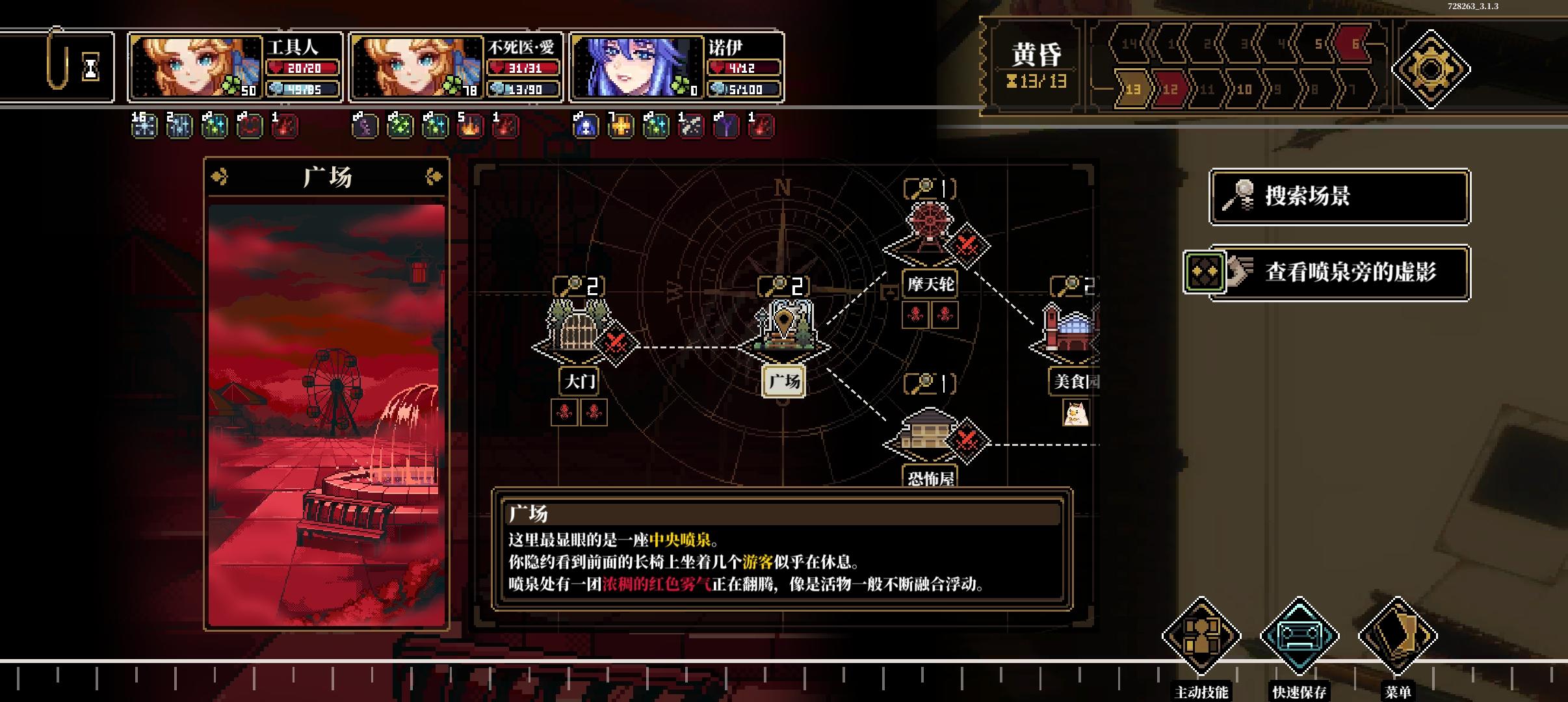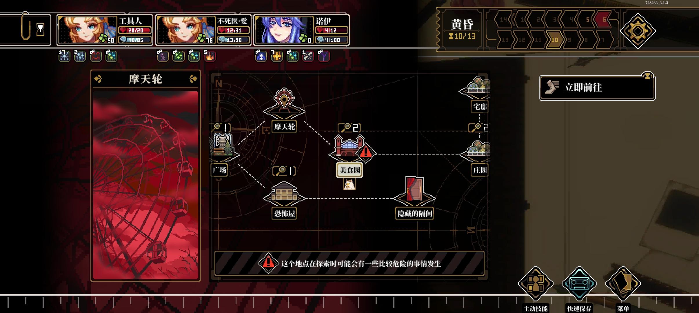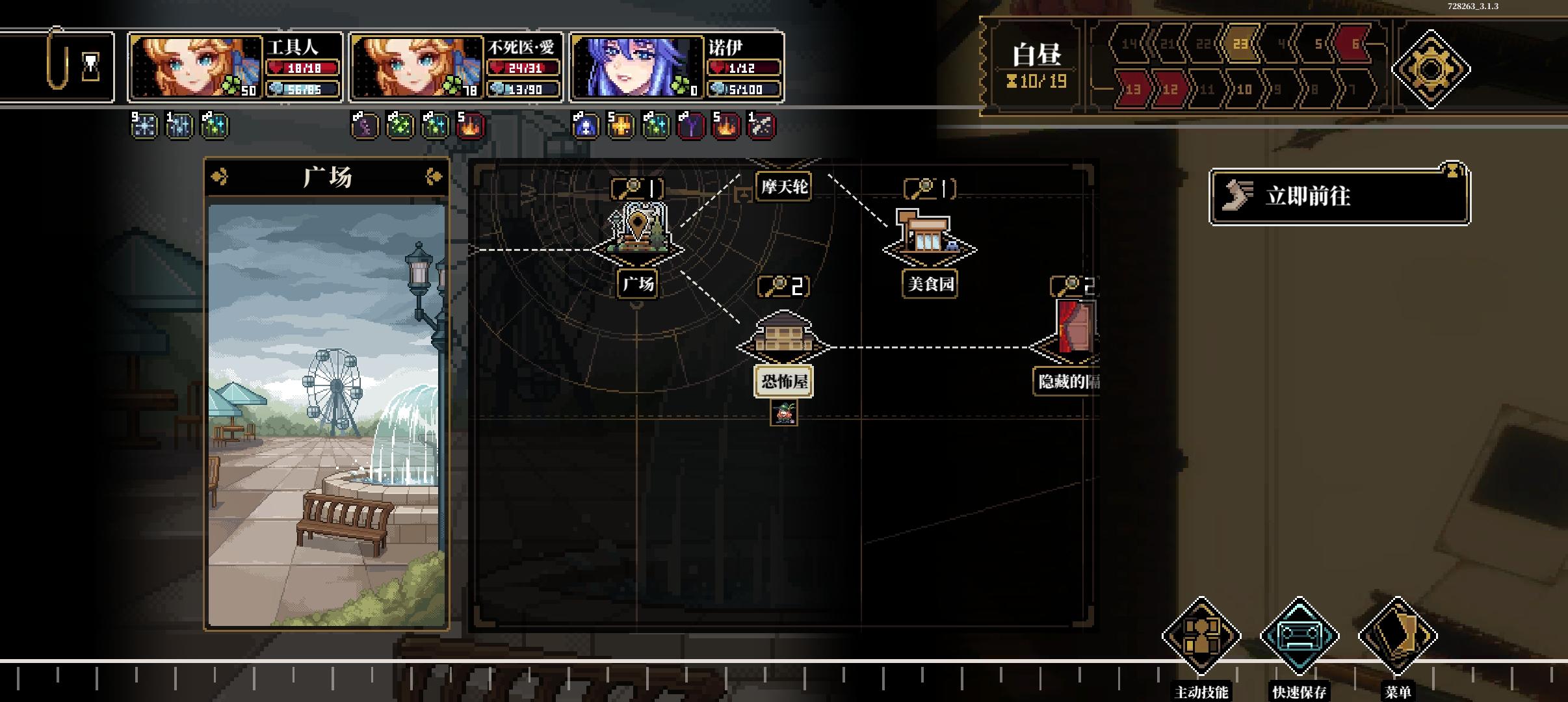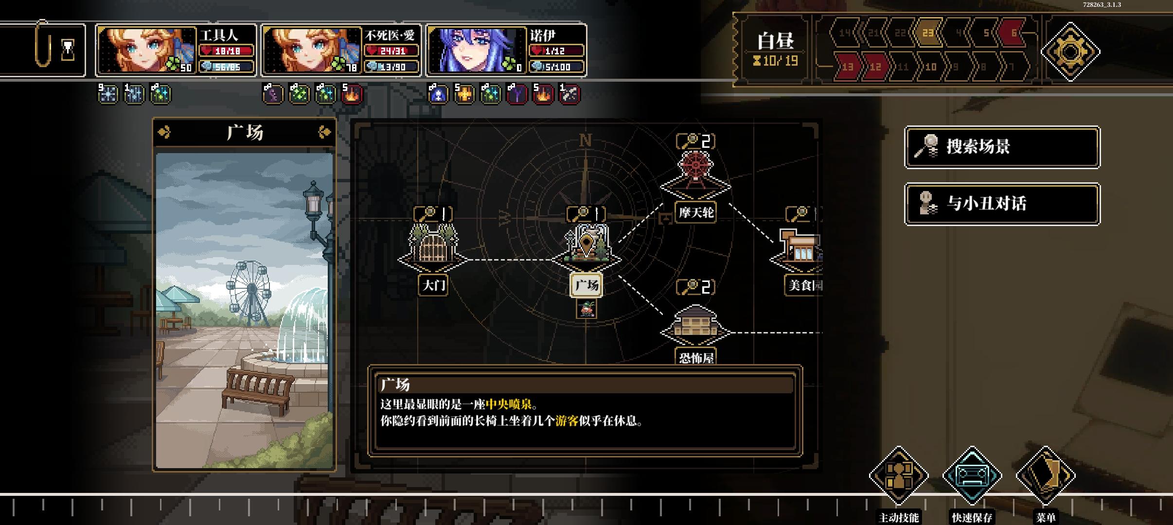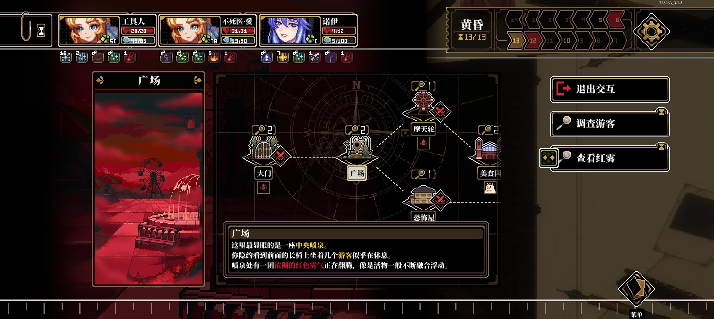 接着剩下三点行动力,移动去大门或恐怖屋,再去广场,这样来花掉进入黄昏,也可以用别的方式。只要保证进入黄昏时人在广场,方便后续路线