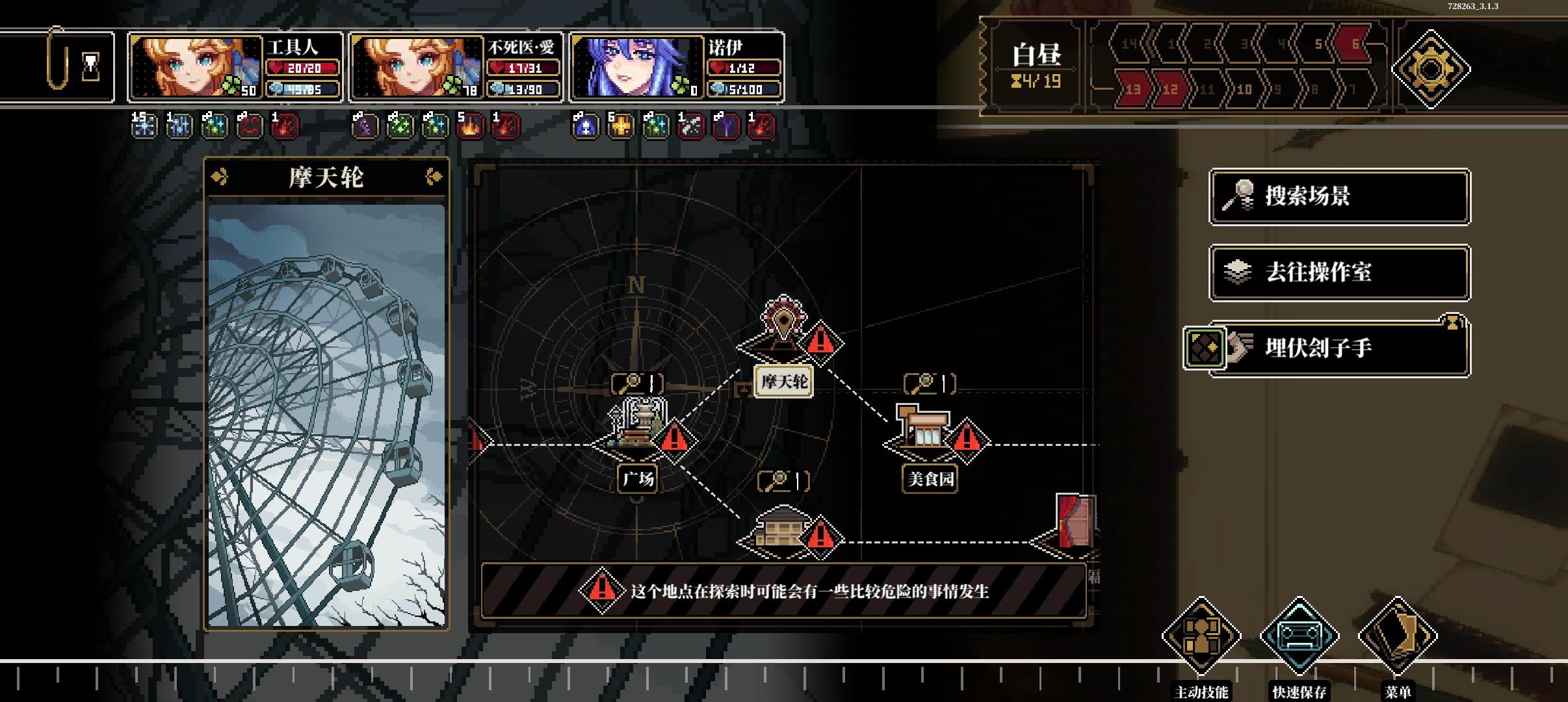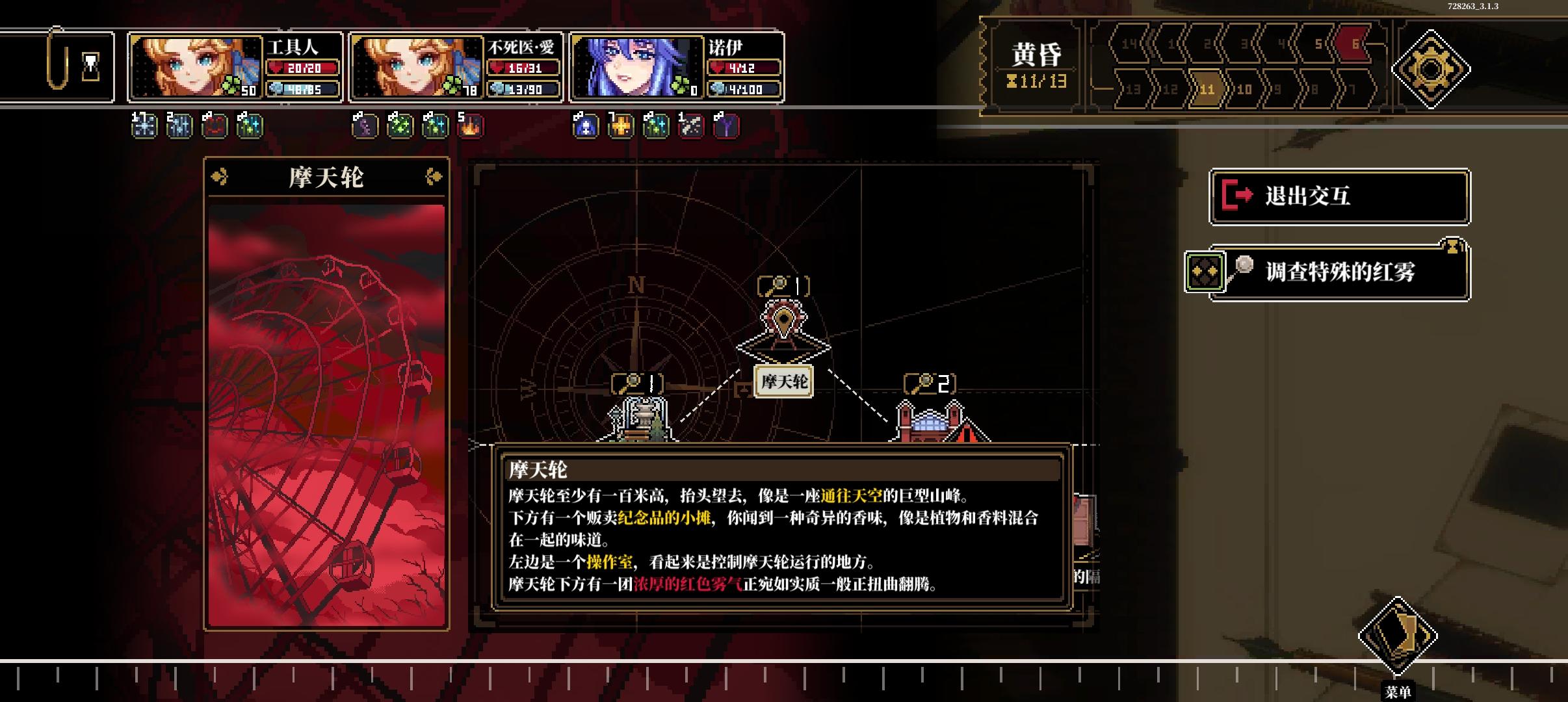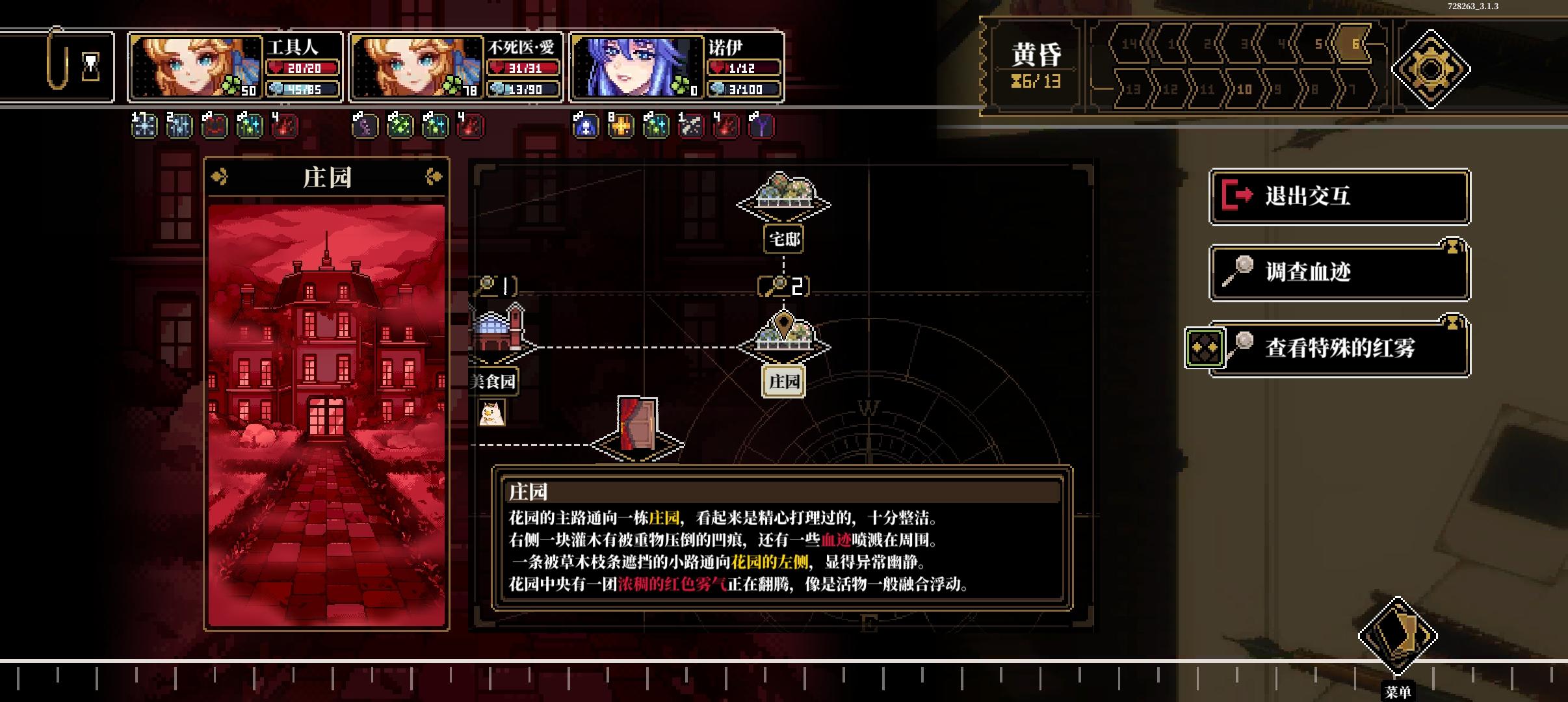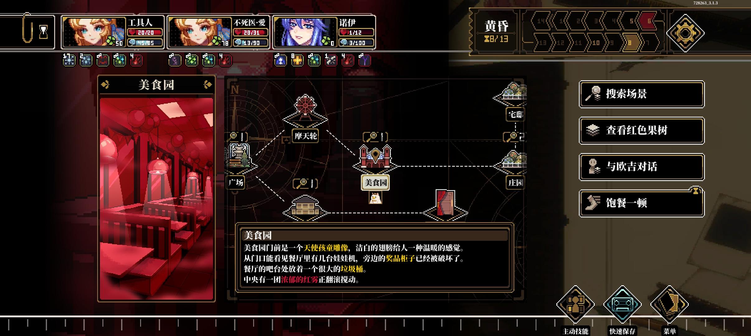接着剩下三点行动力,移动去大门或恐怖屋,再去广场,这样来花掉进入黄昏,也可以用别的方式。只要保证进入黄昏时人在广场,方便后续路线