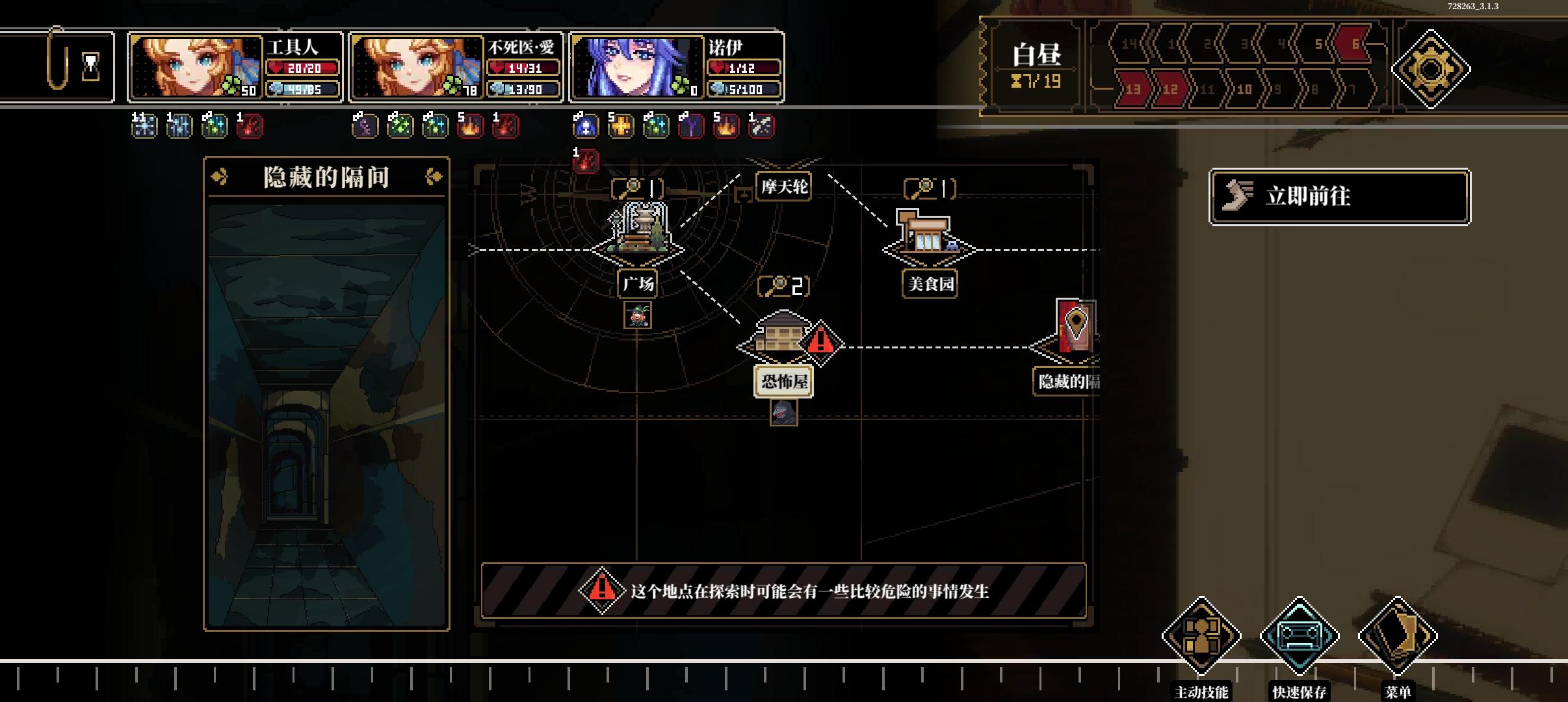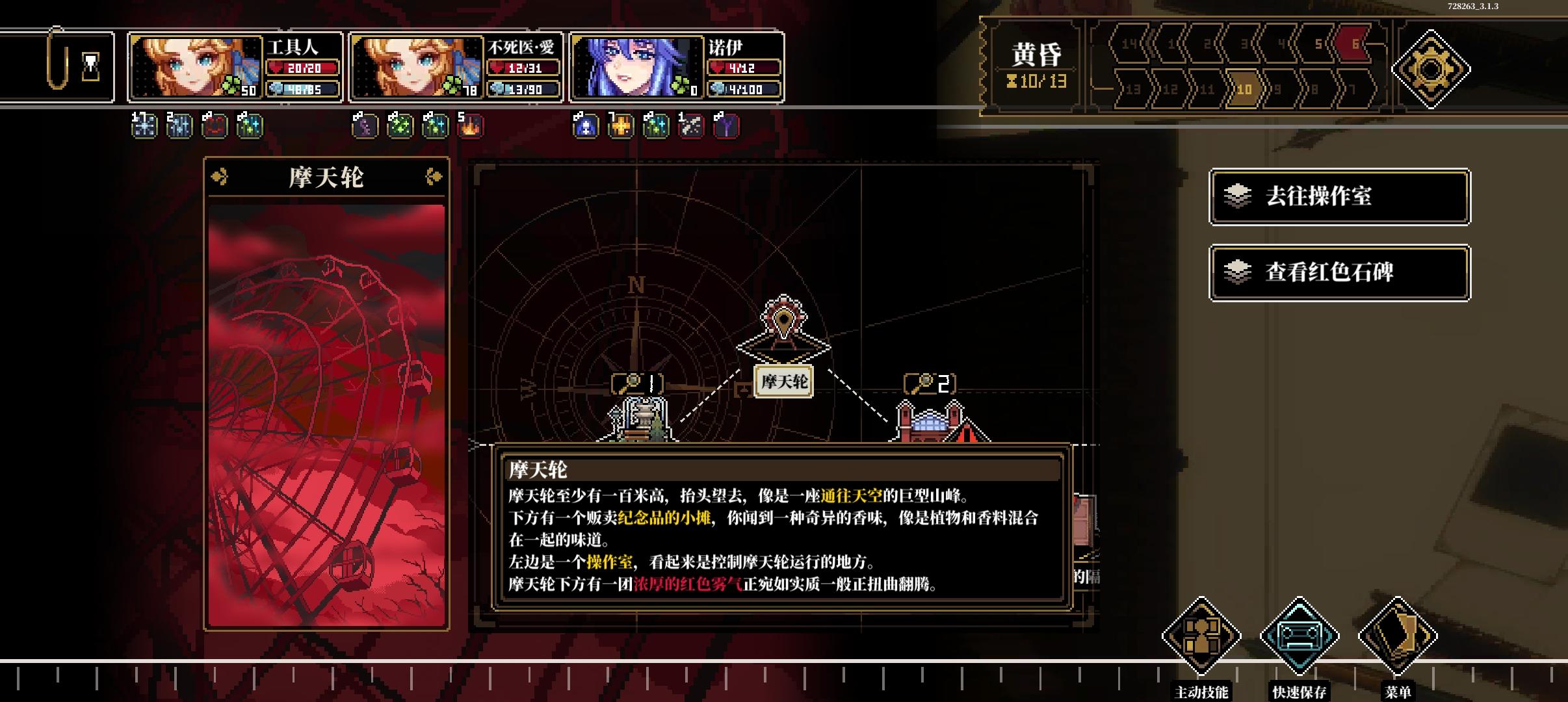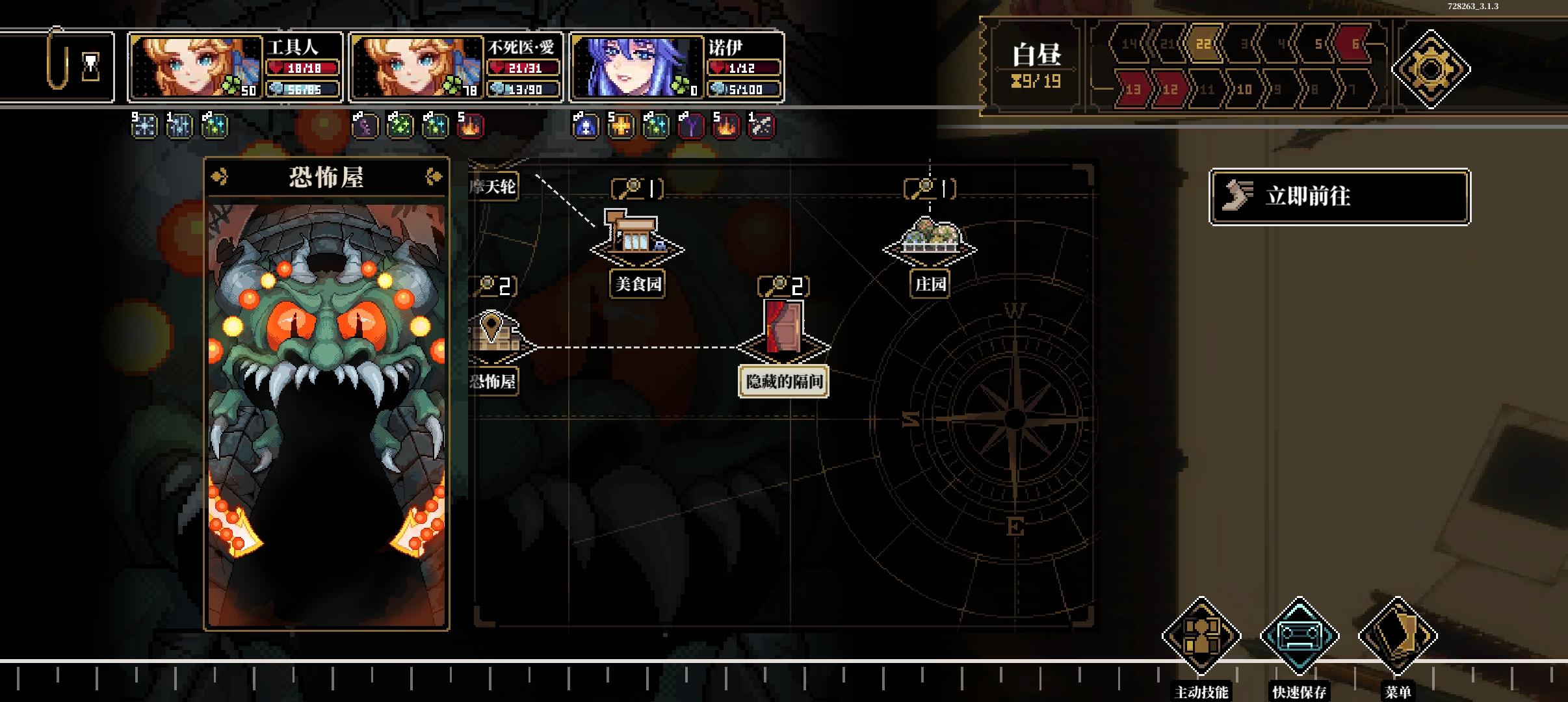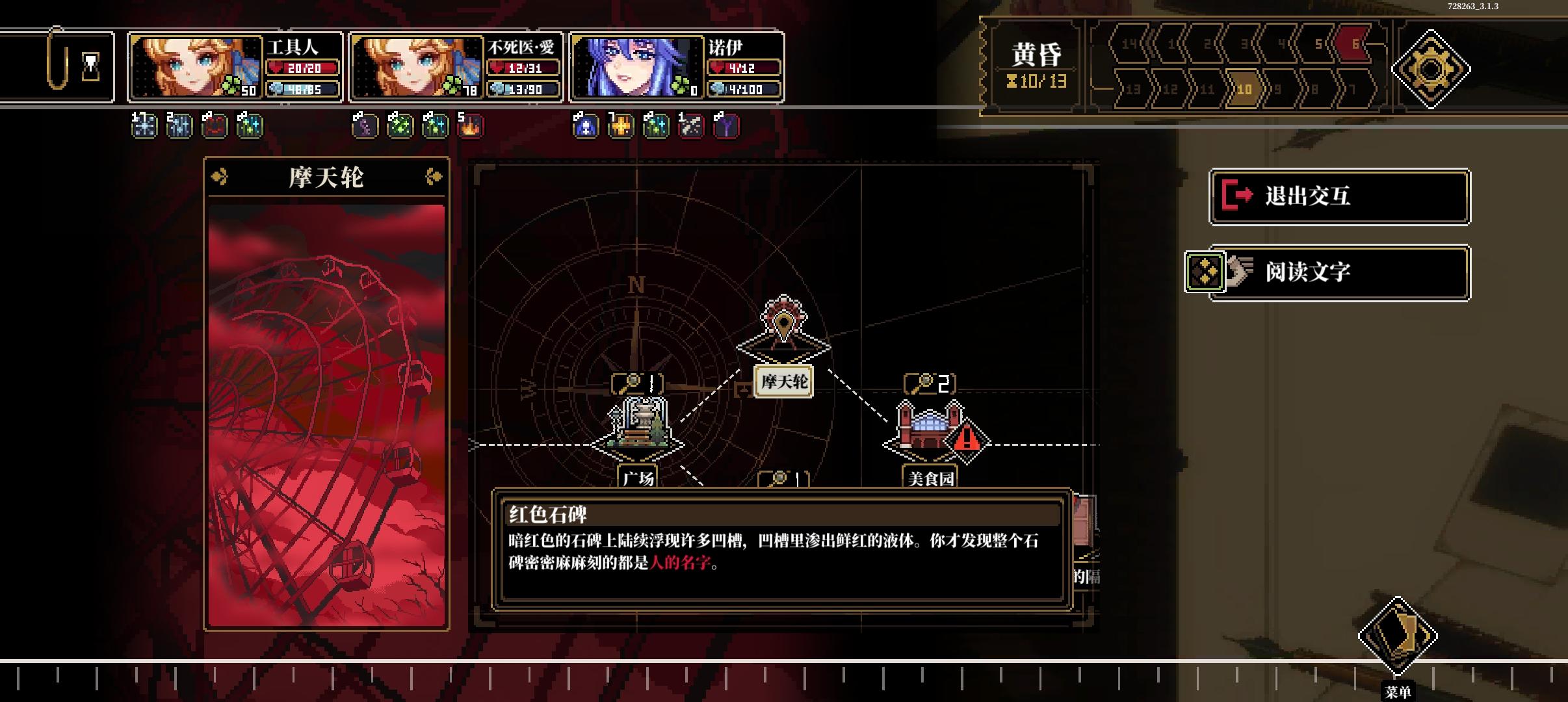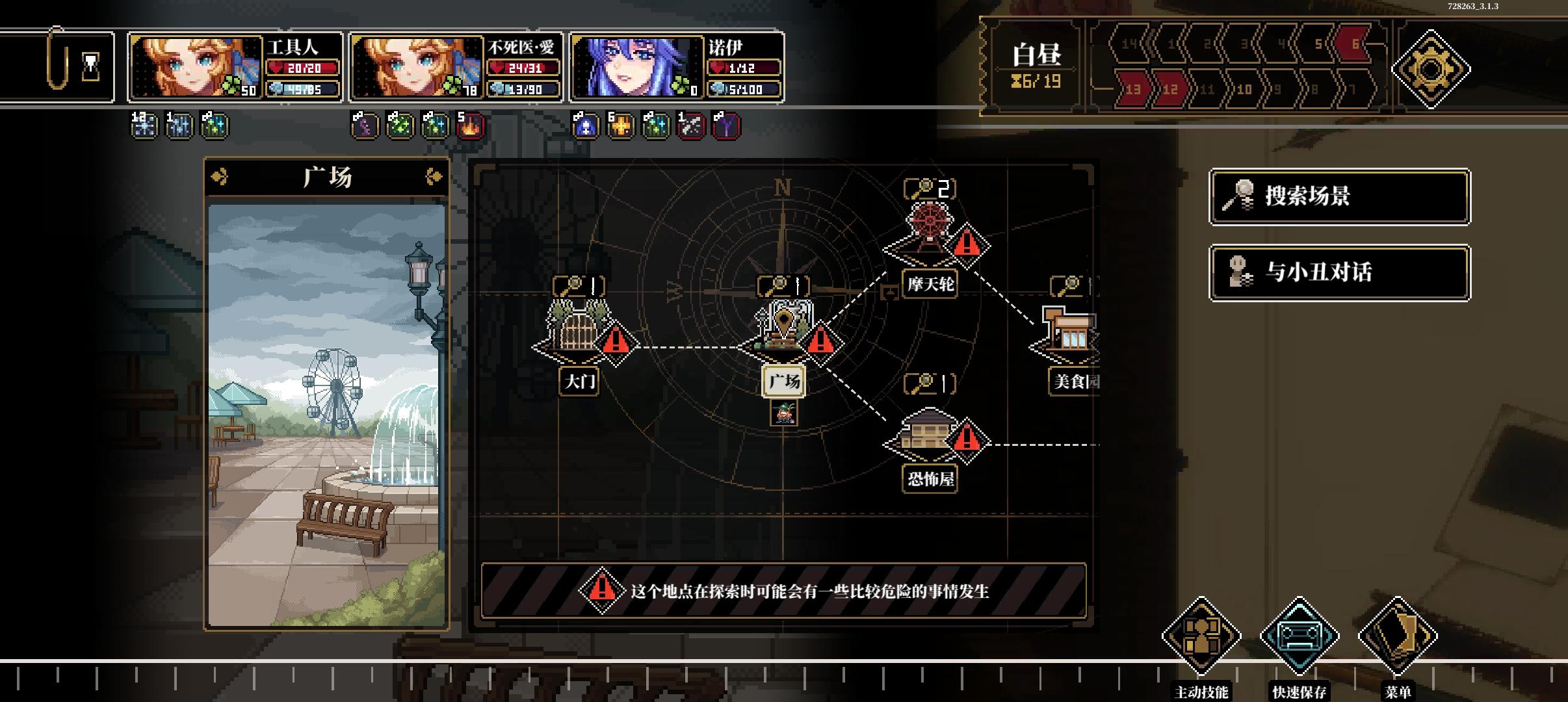 接着剩下三点行动力,移动去大门或恐怖屋,再去广场,这样来花掉进入黄昏,也可以用别的方式。只要保证进入黄昏时人在广场,方便后续路线