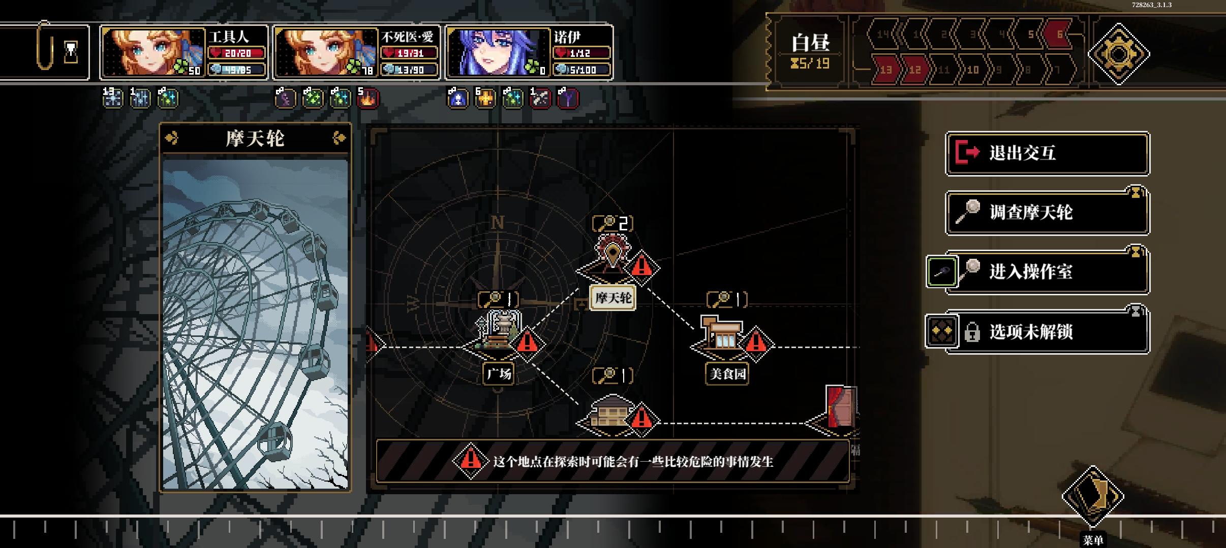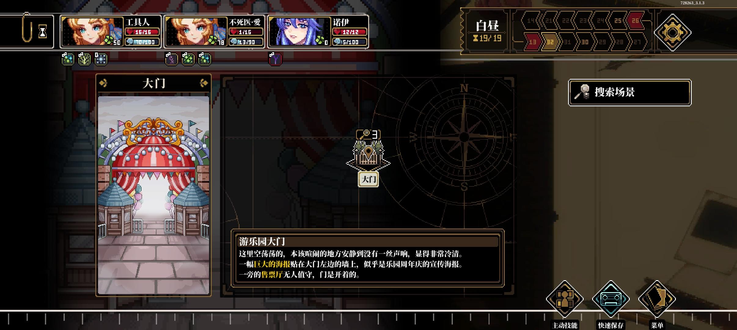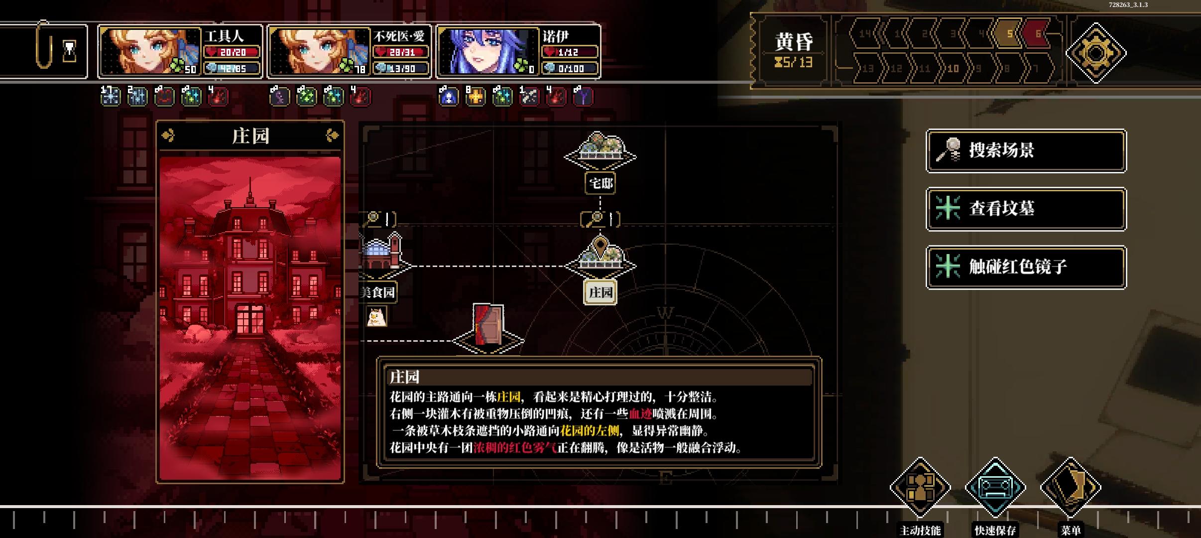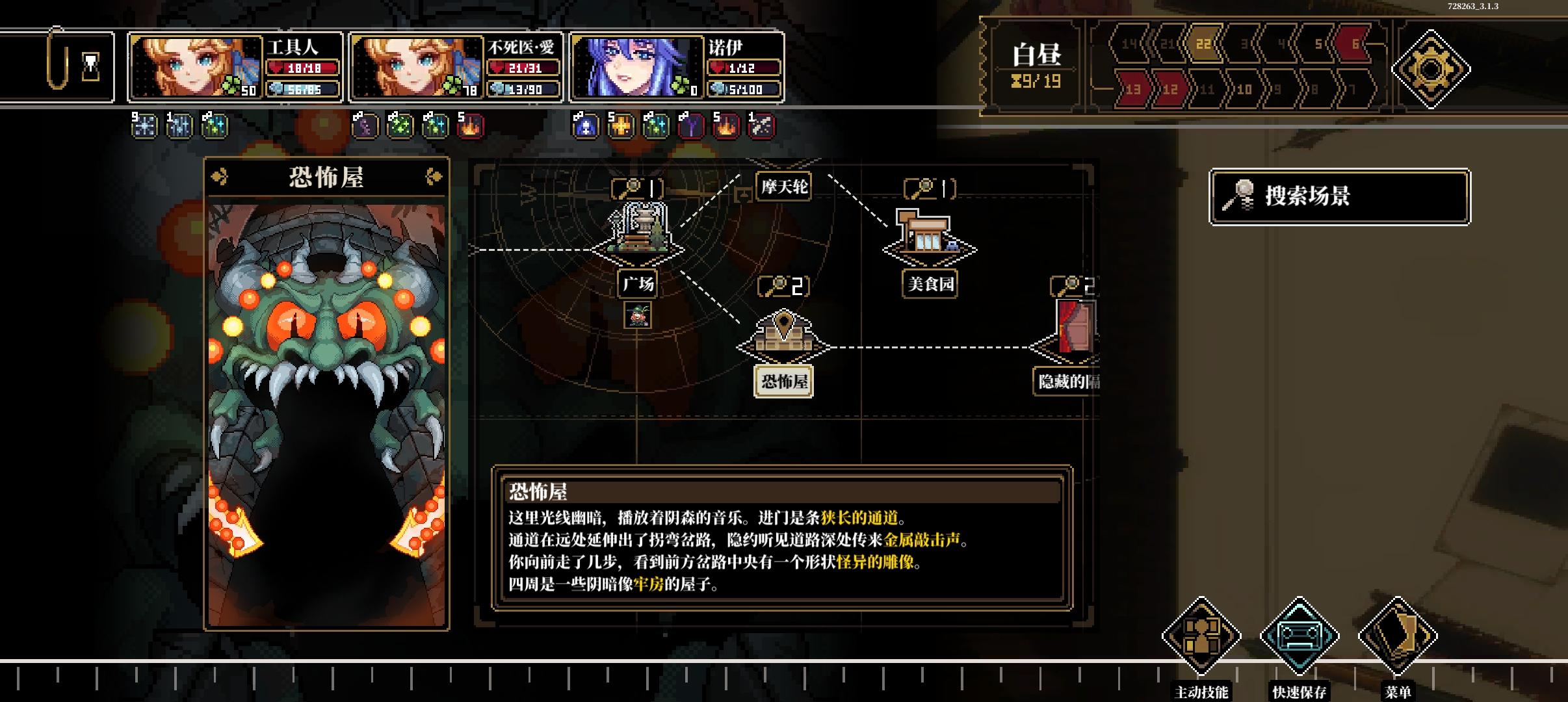 接着剩下三点行动力,移动去大门或恐怖屋,再去广场,这样来花掉进入黄昏,也可以用别的方式。只要保证进入黄昏时人在广场,方便后续路线