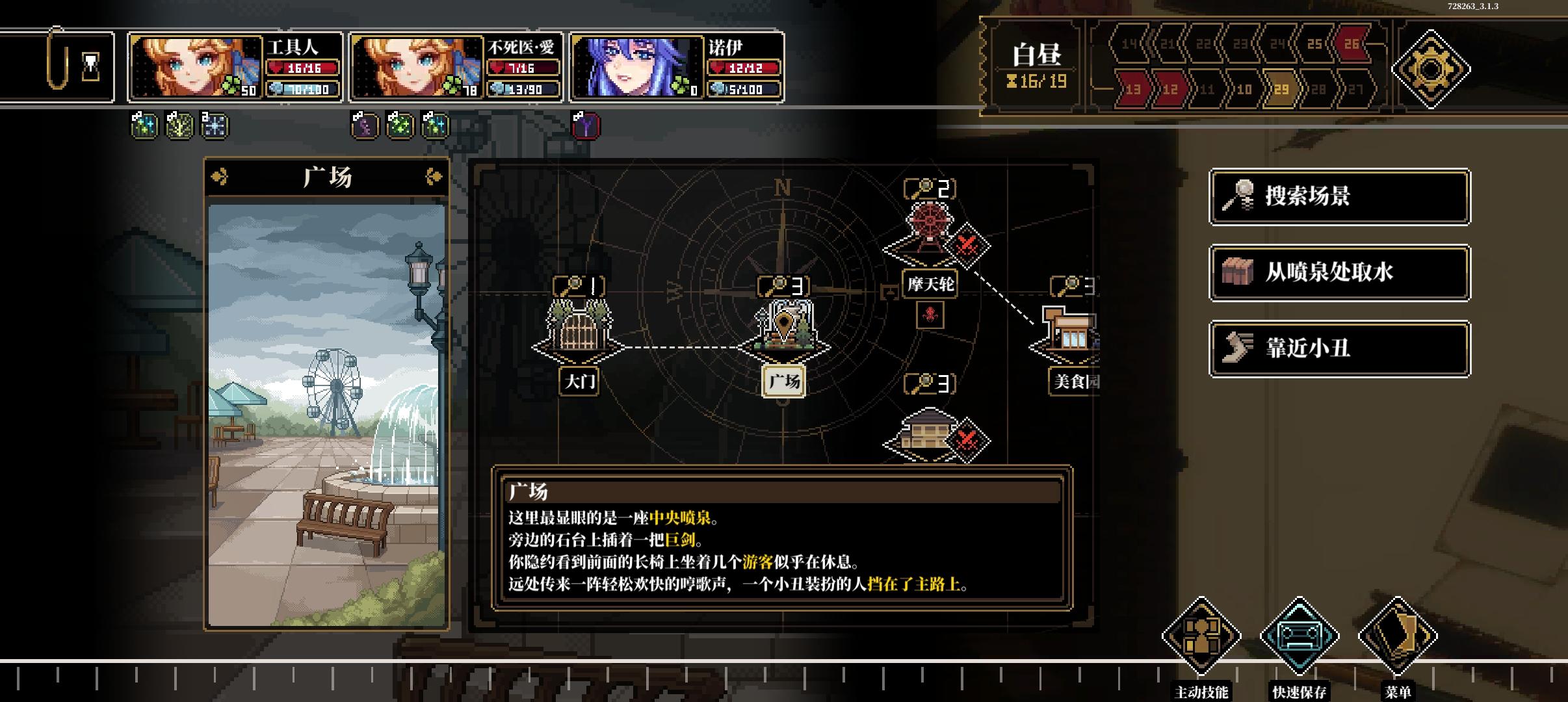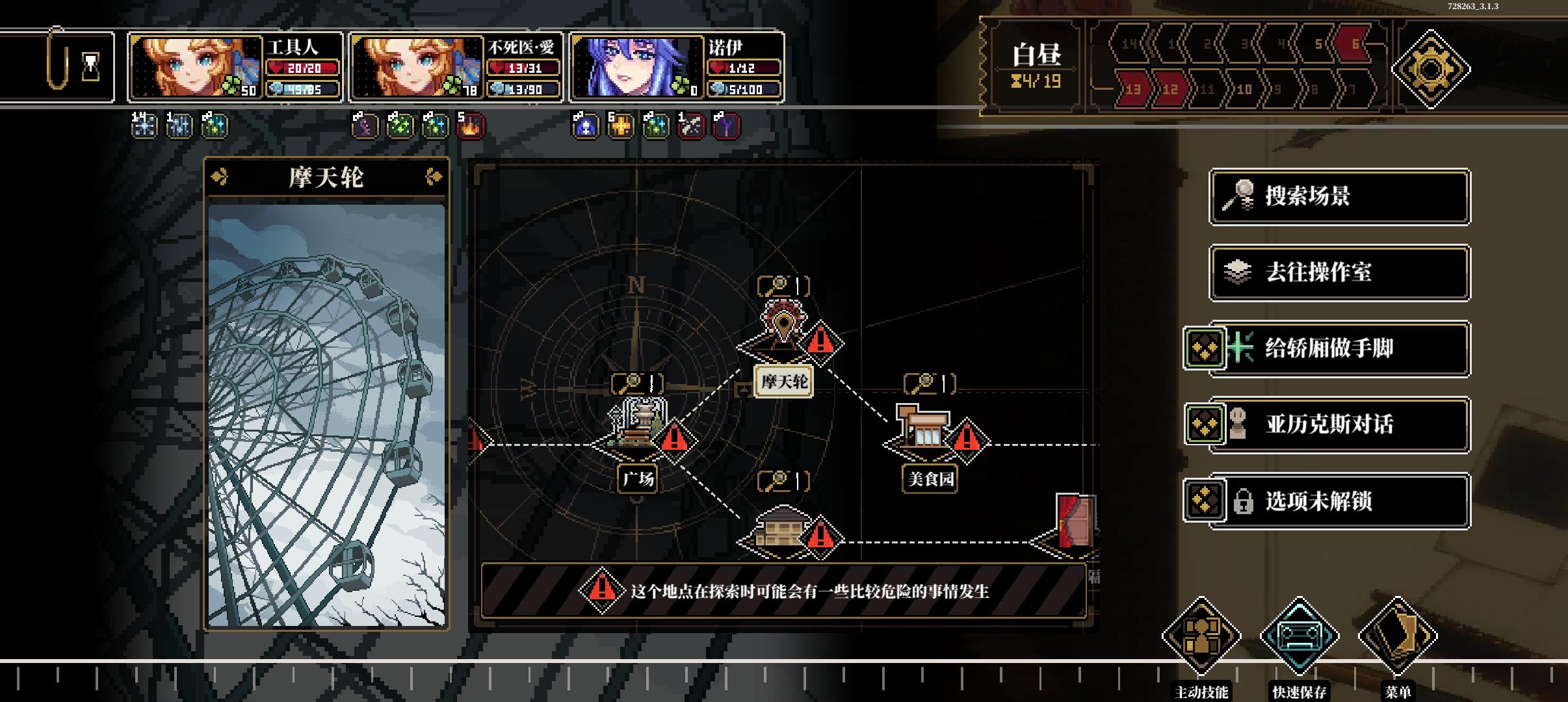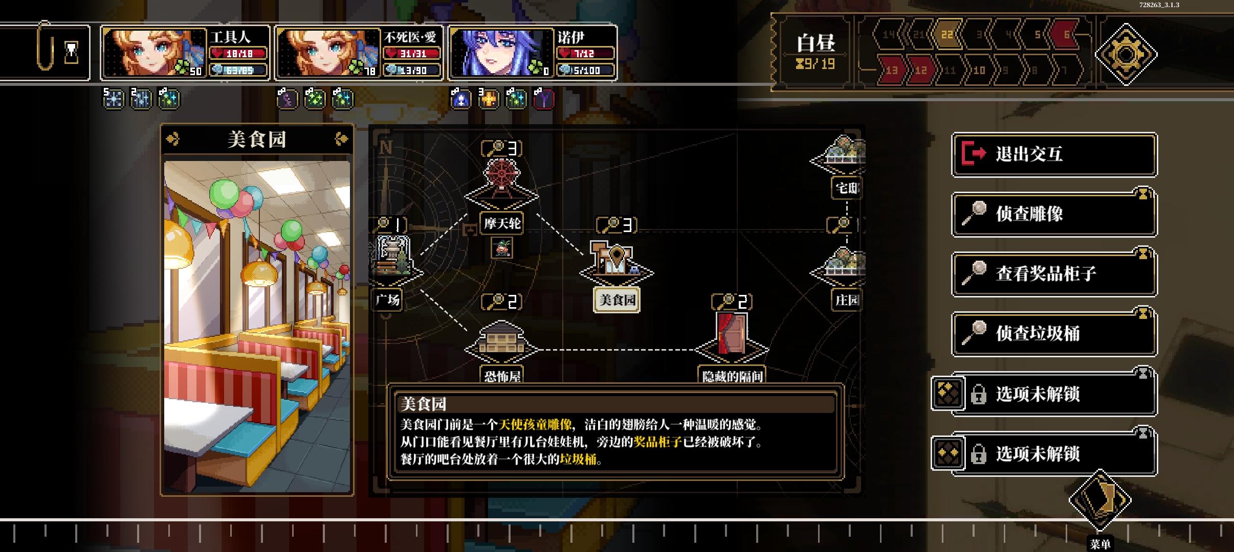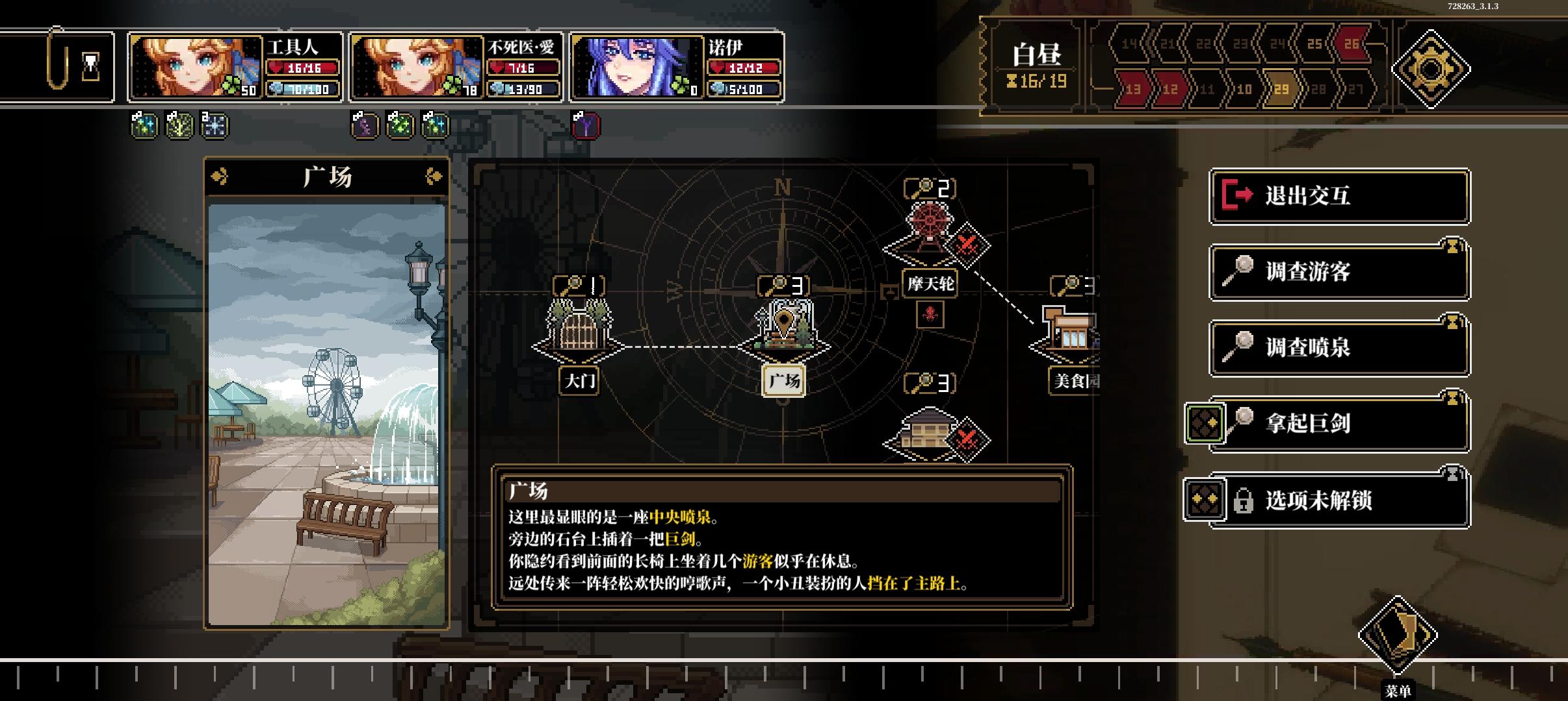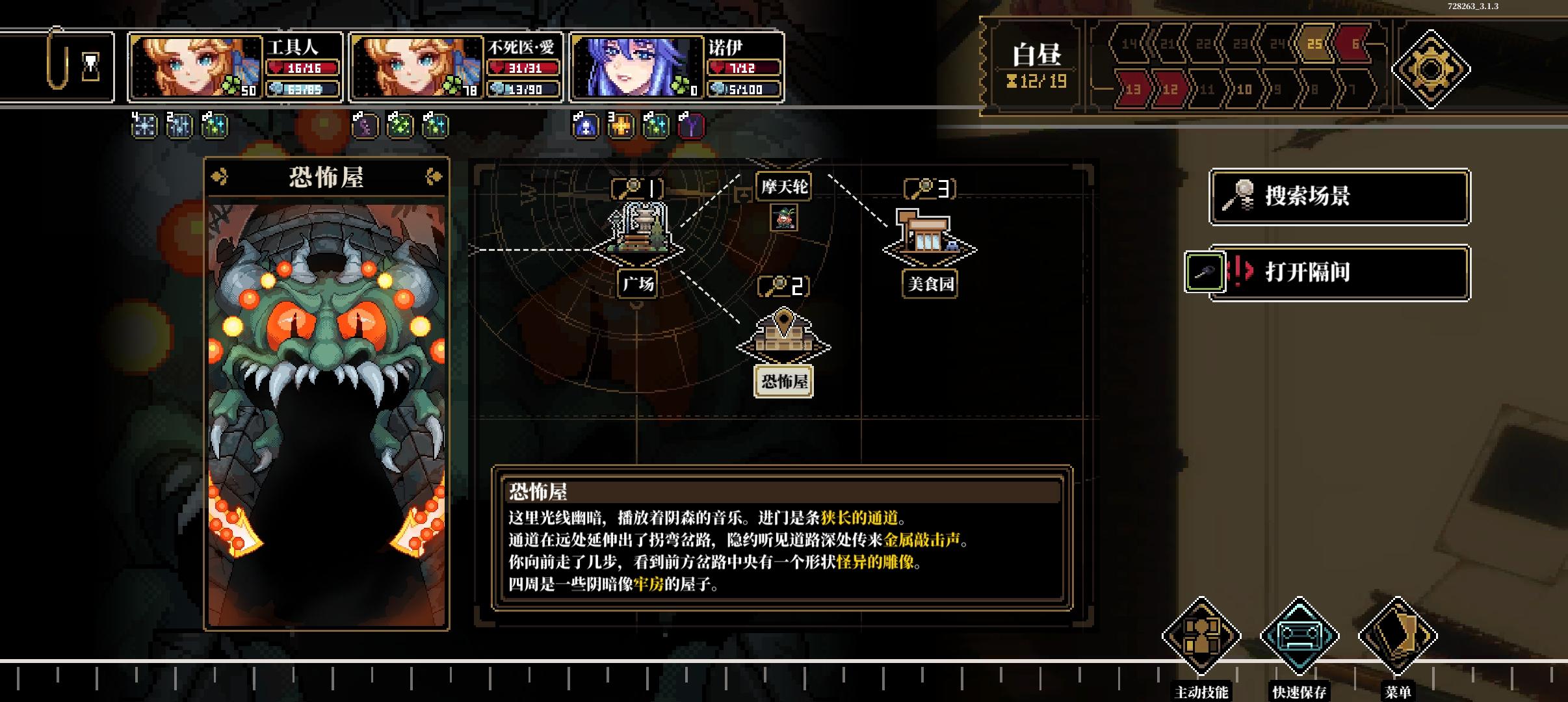 接着剩下三点行动力,移动去大门或恐怖屋,再去广场,这样来花掉进入黄昏,也可以用别的方式。只要保证进入黄昏时人在广场,方便后续路线
