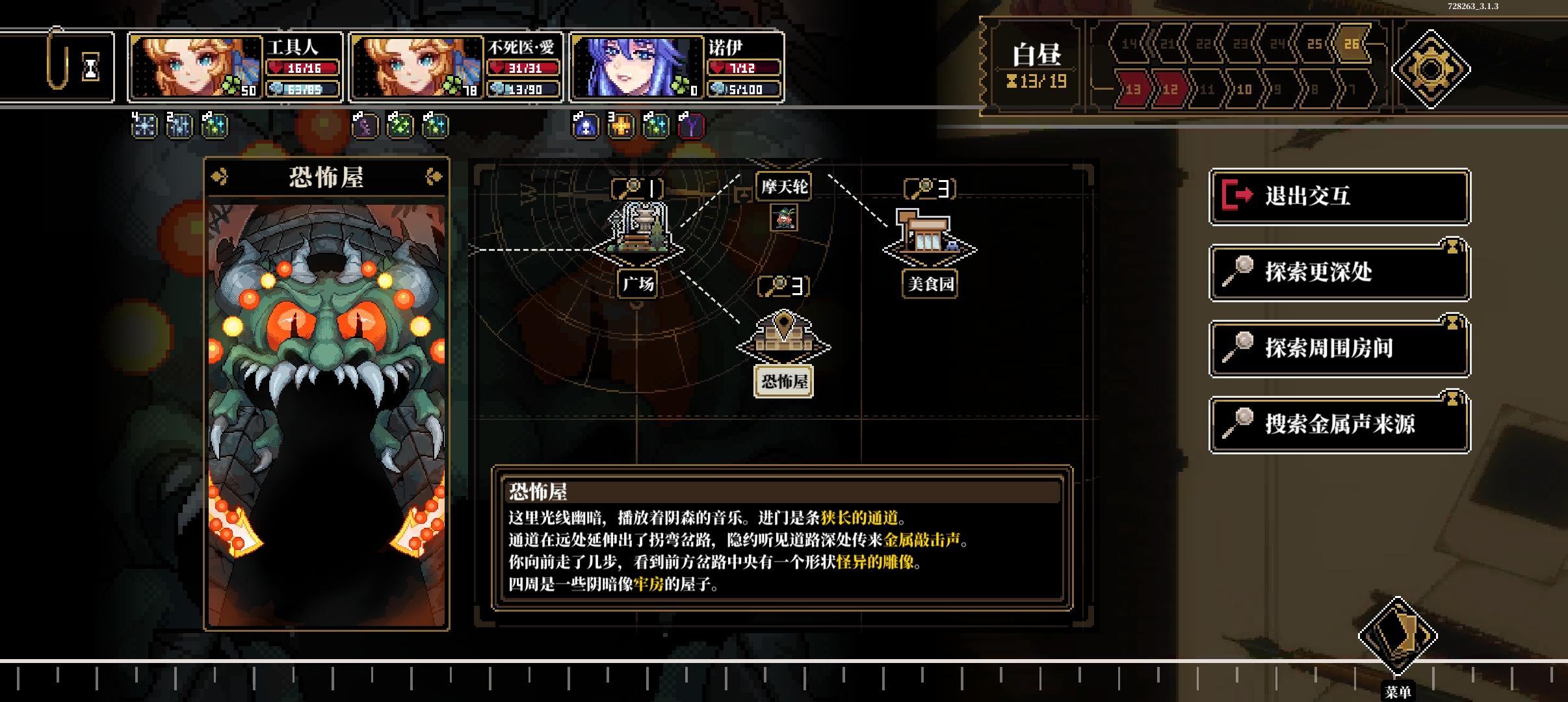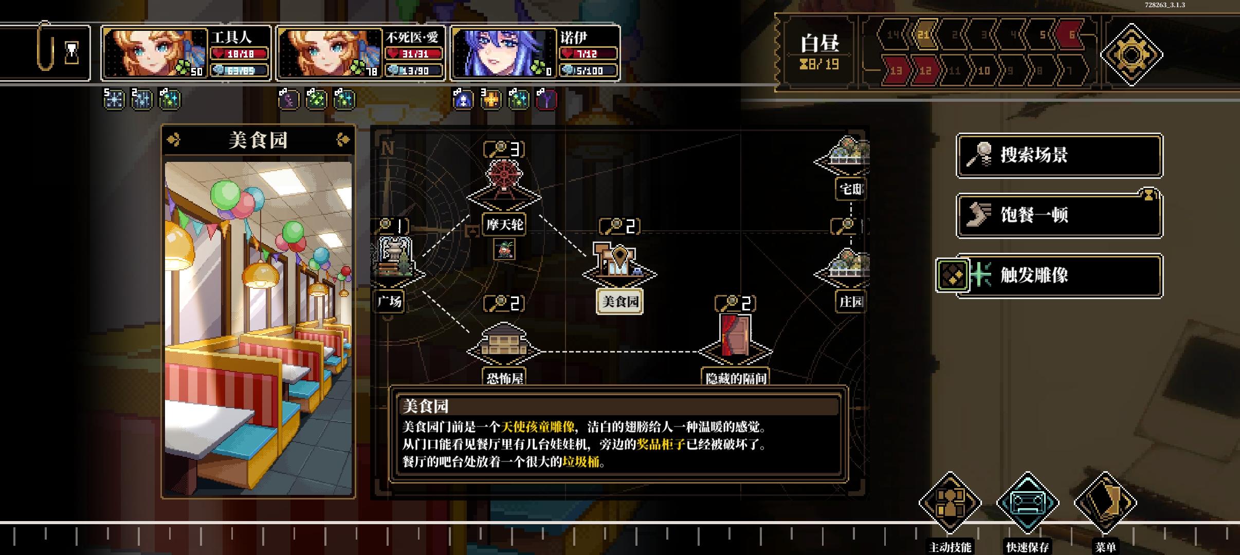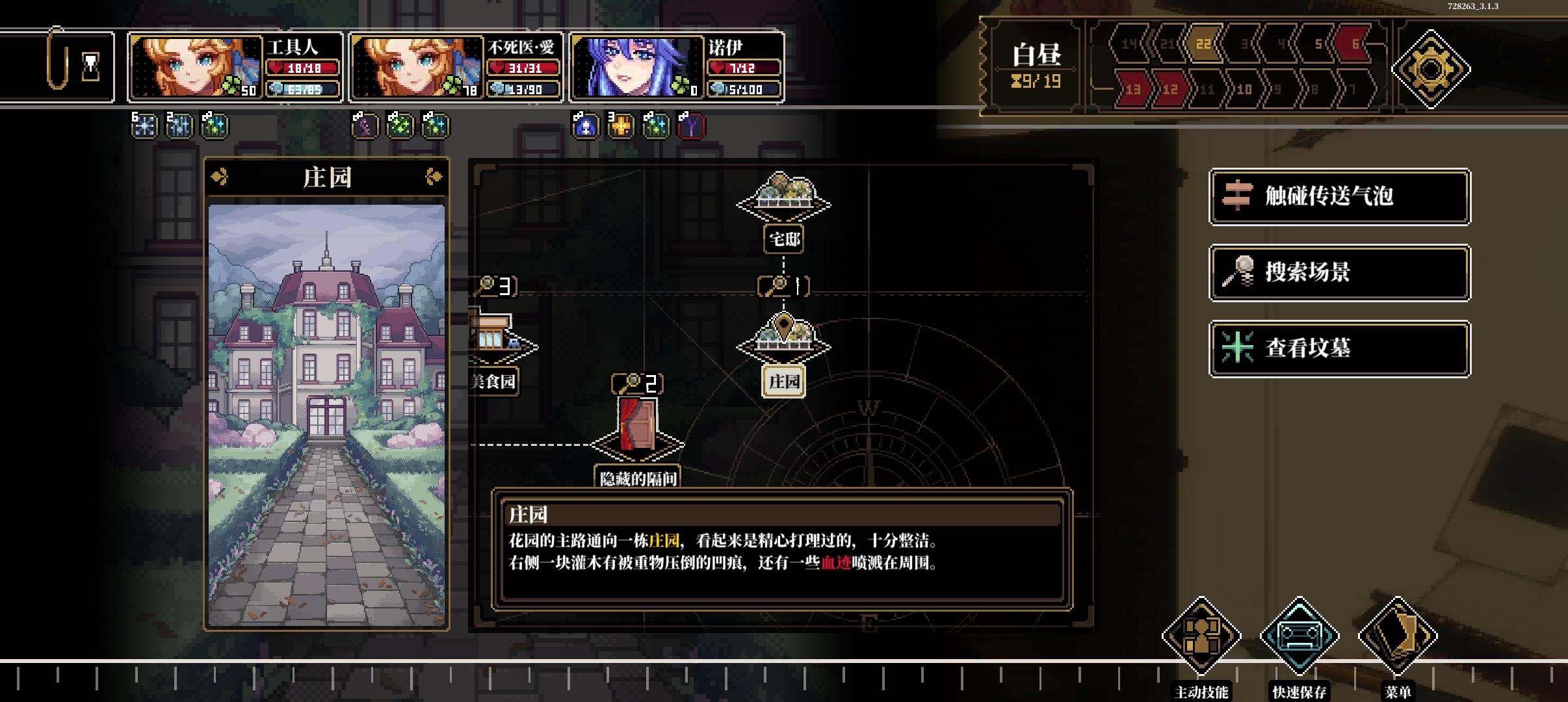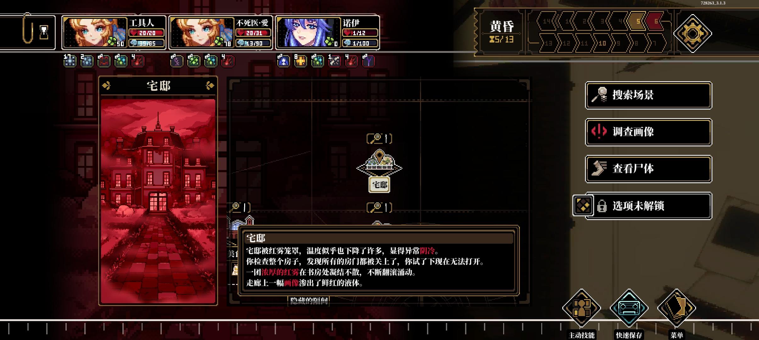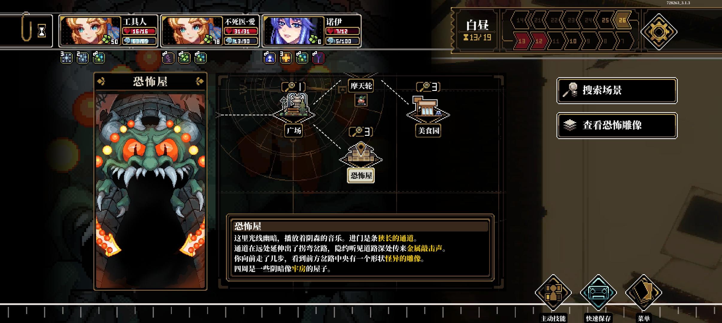 接着剩下三点行动力,移动去大门或恐怖屋,再去广场,这样来花掉进入黄昏,也可以用别的方式。只要保证进入黄昏时人在广场,方便后续路线