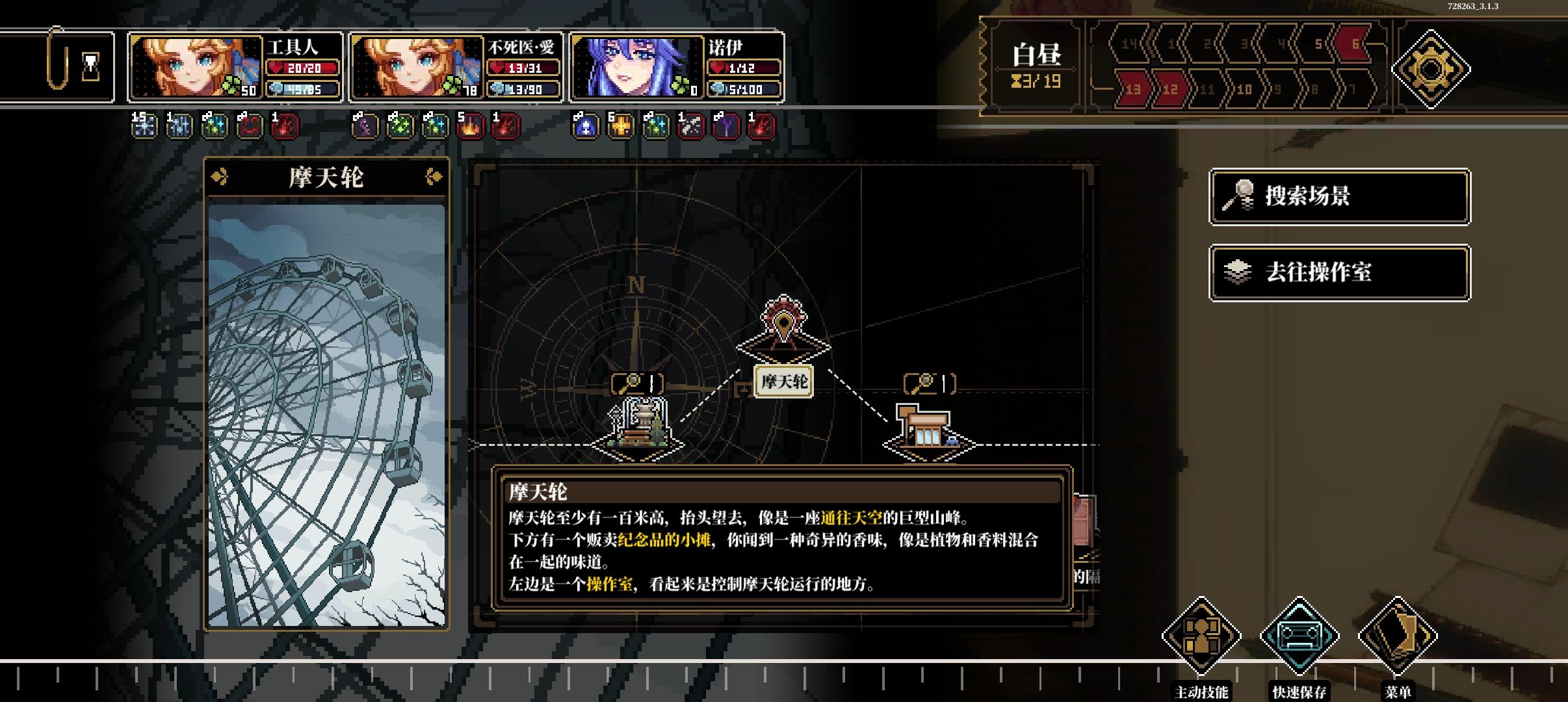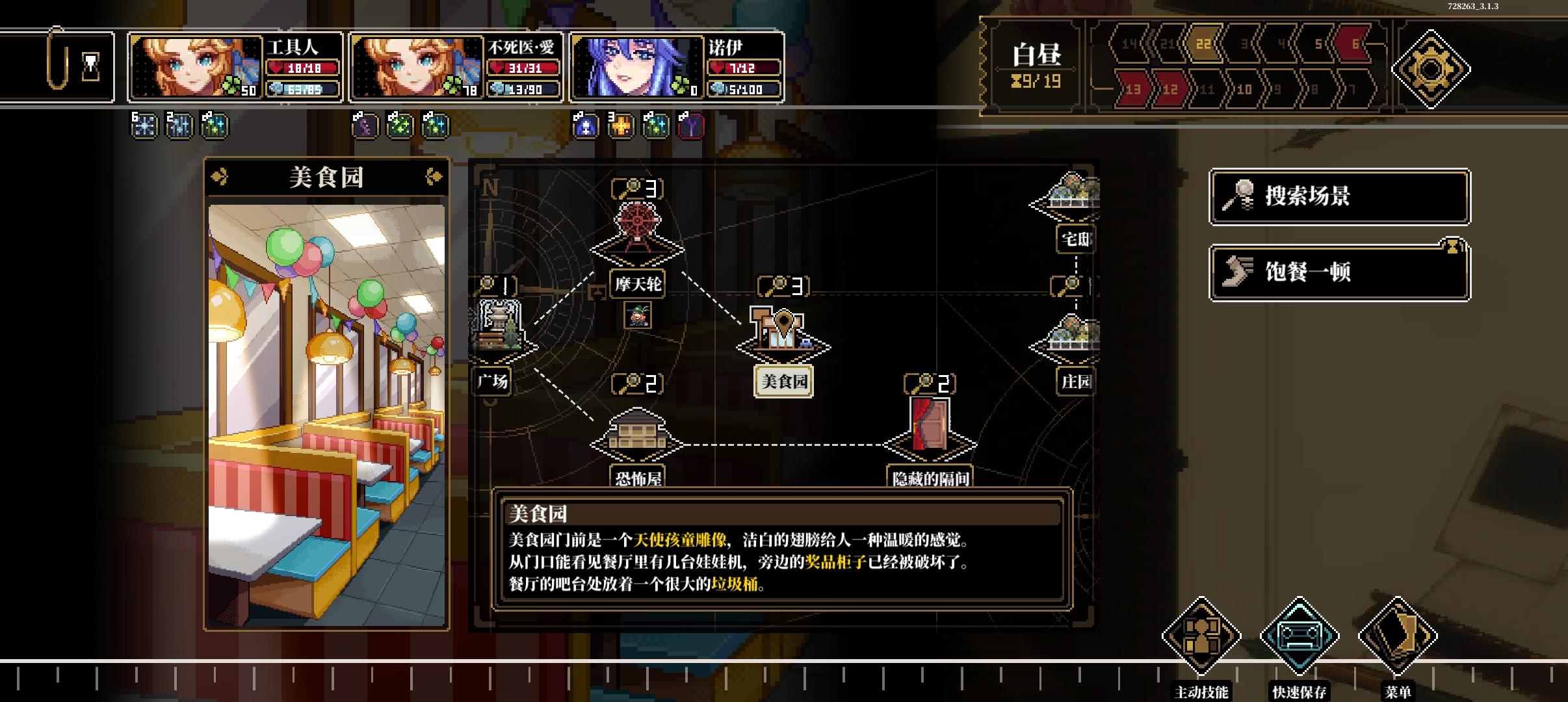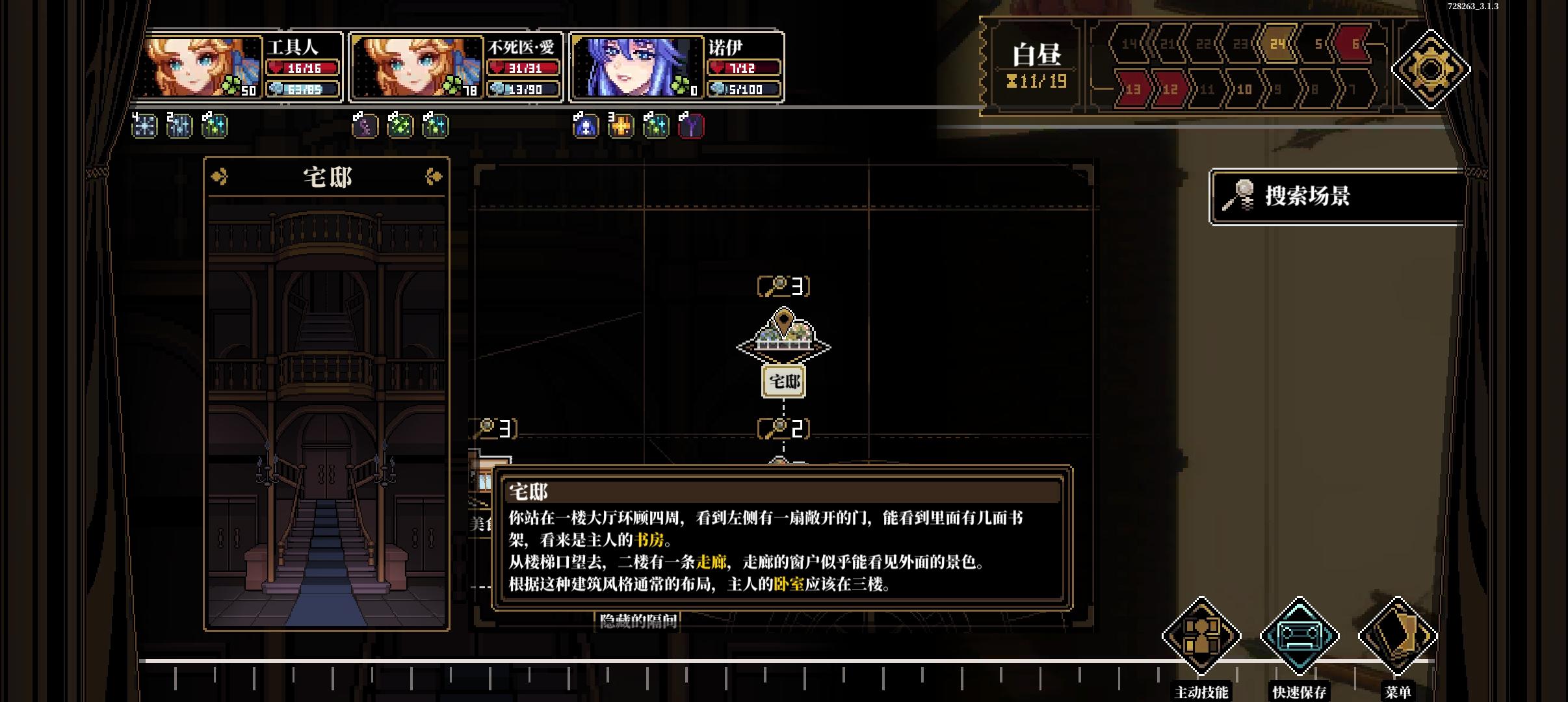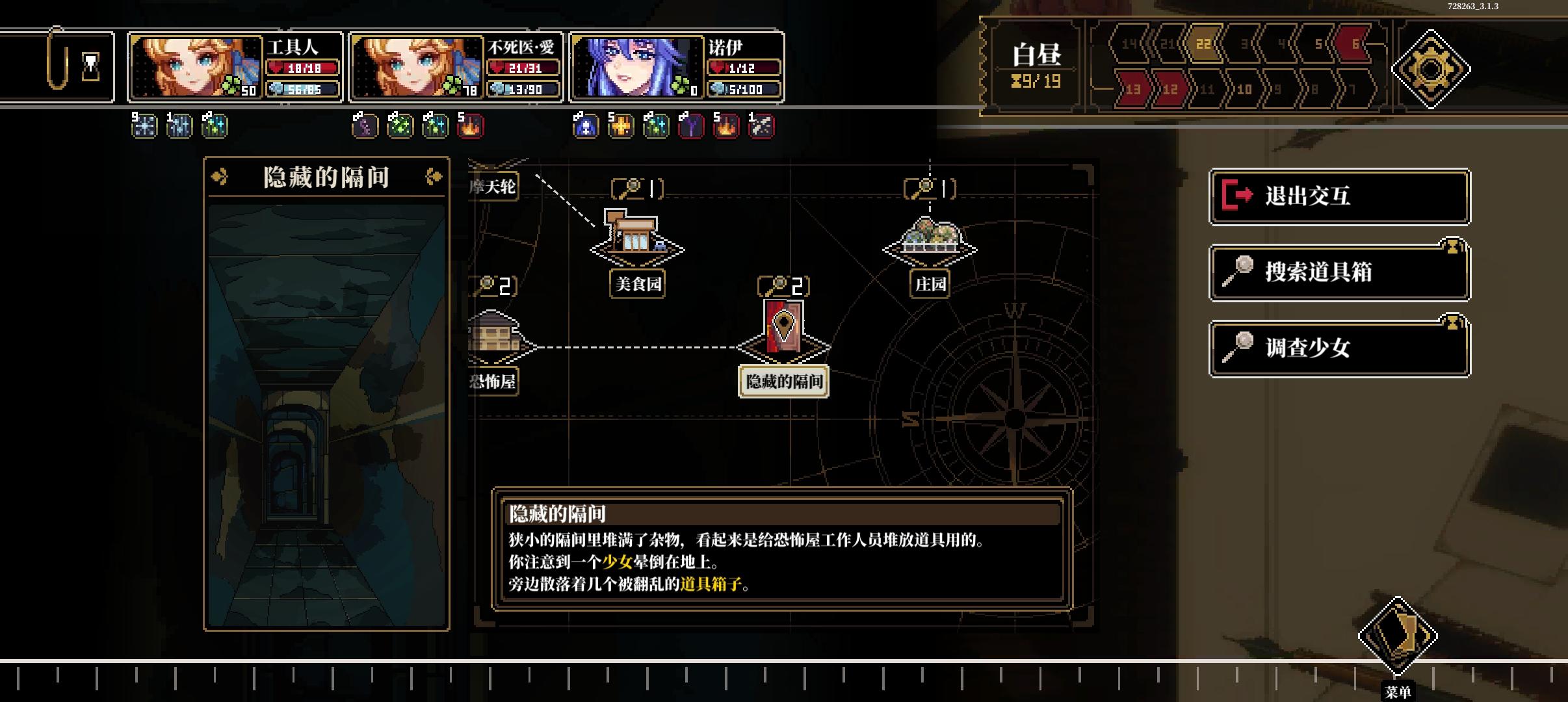 接着剩下三点行动力,移动去大门或恐怖屋,再去广场,这样来花掉进入黄昏,也可以用别的方式。只要保证进入黄昏时人在广场,方便后续路线