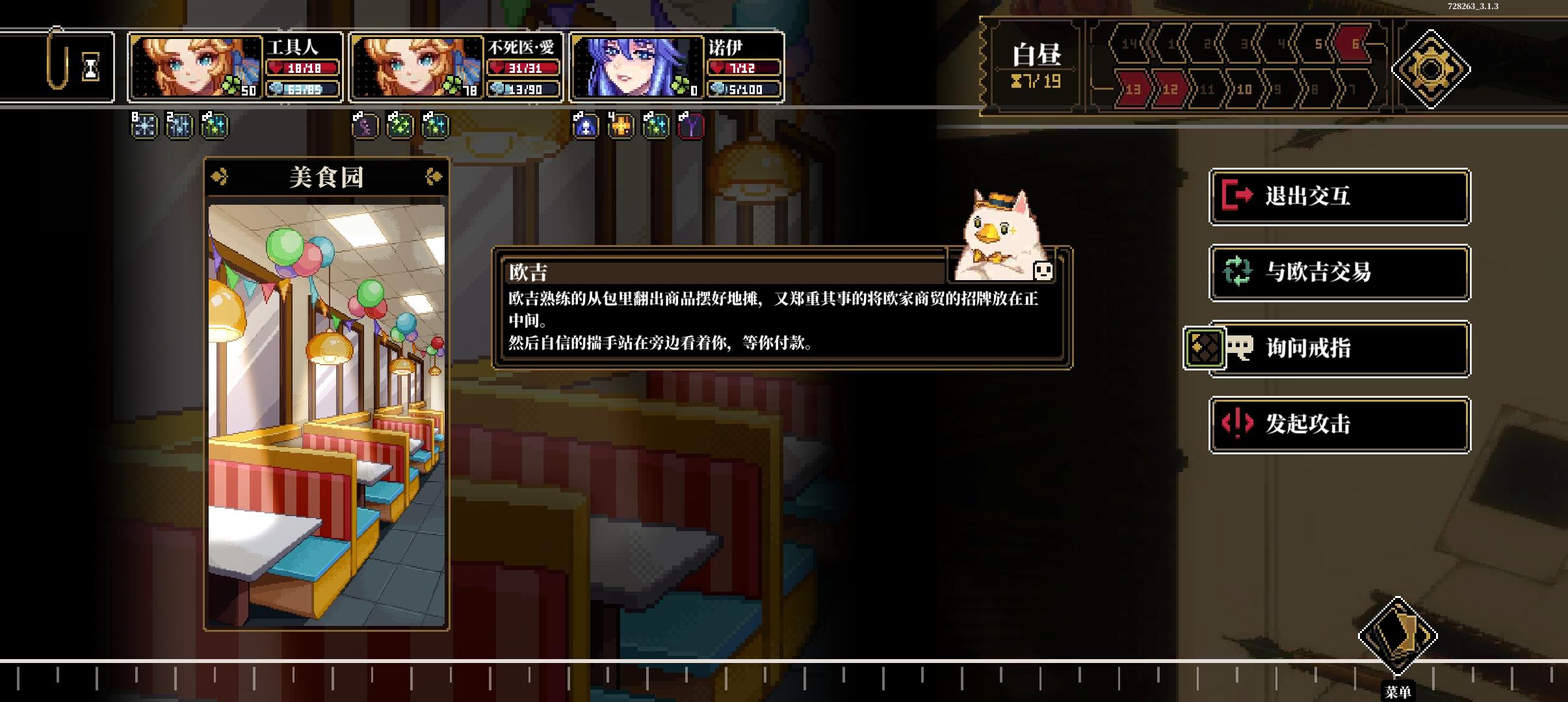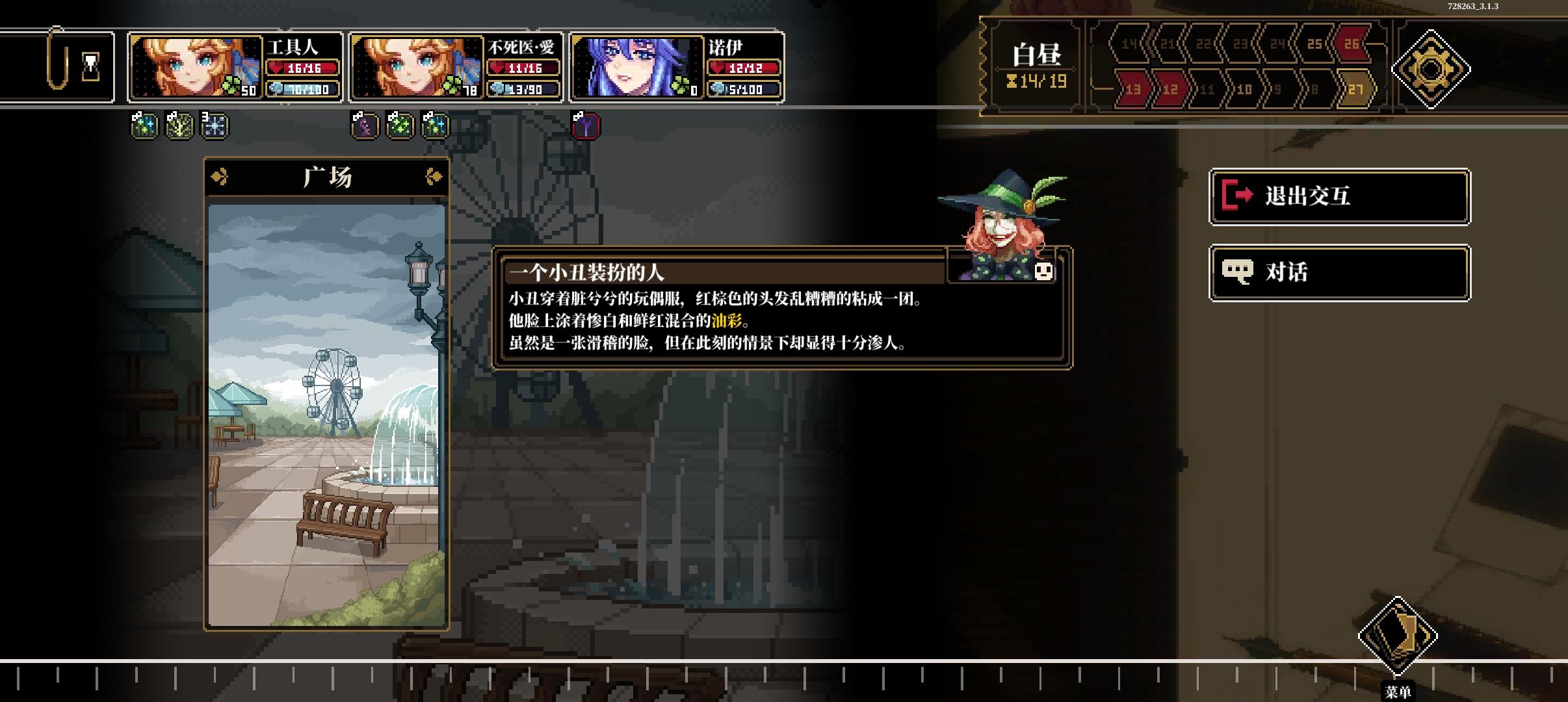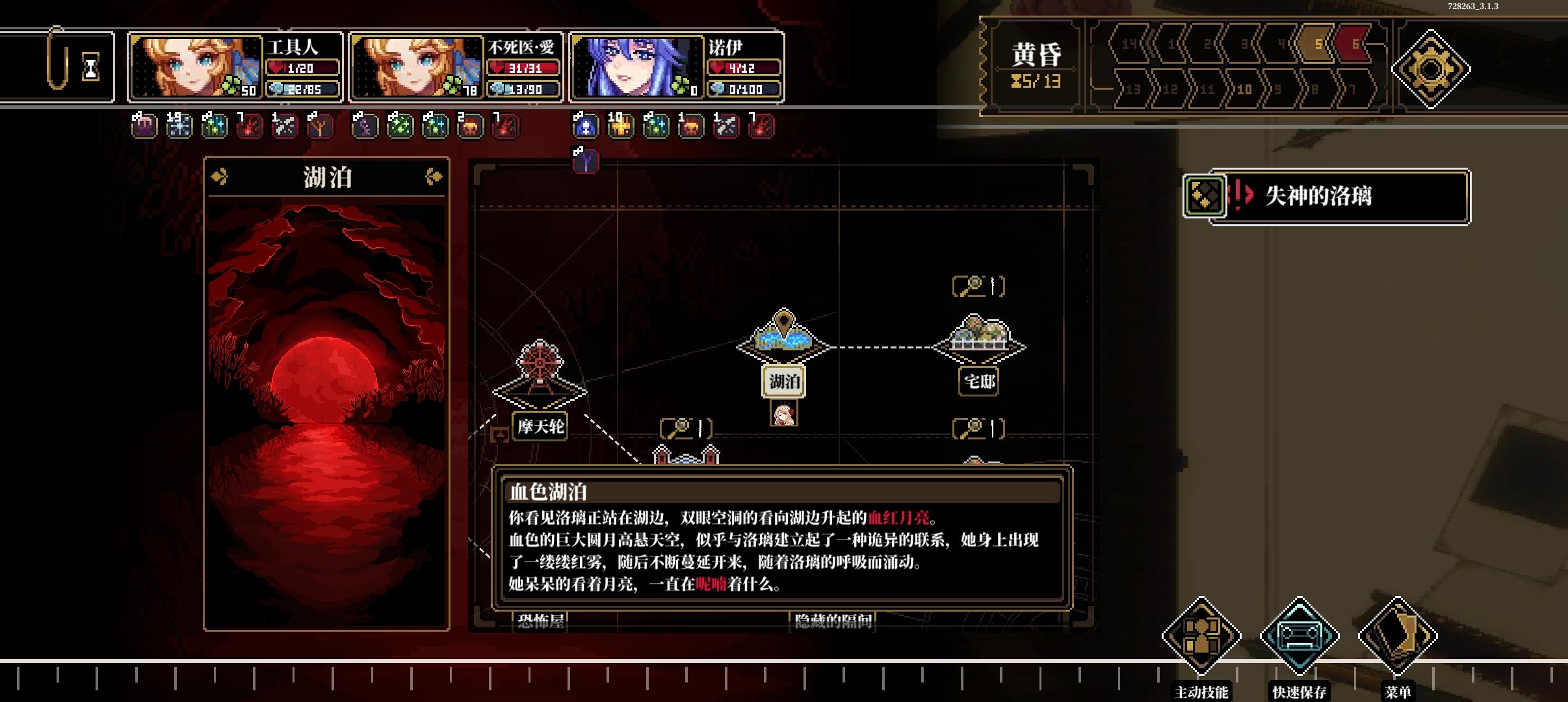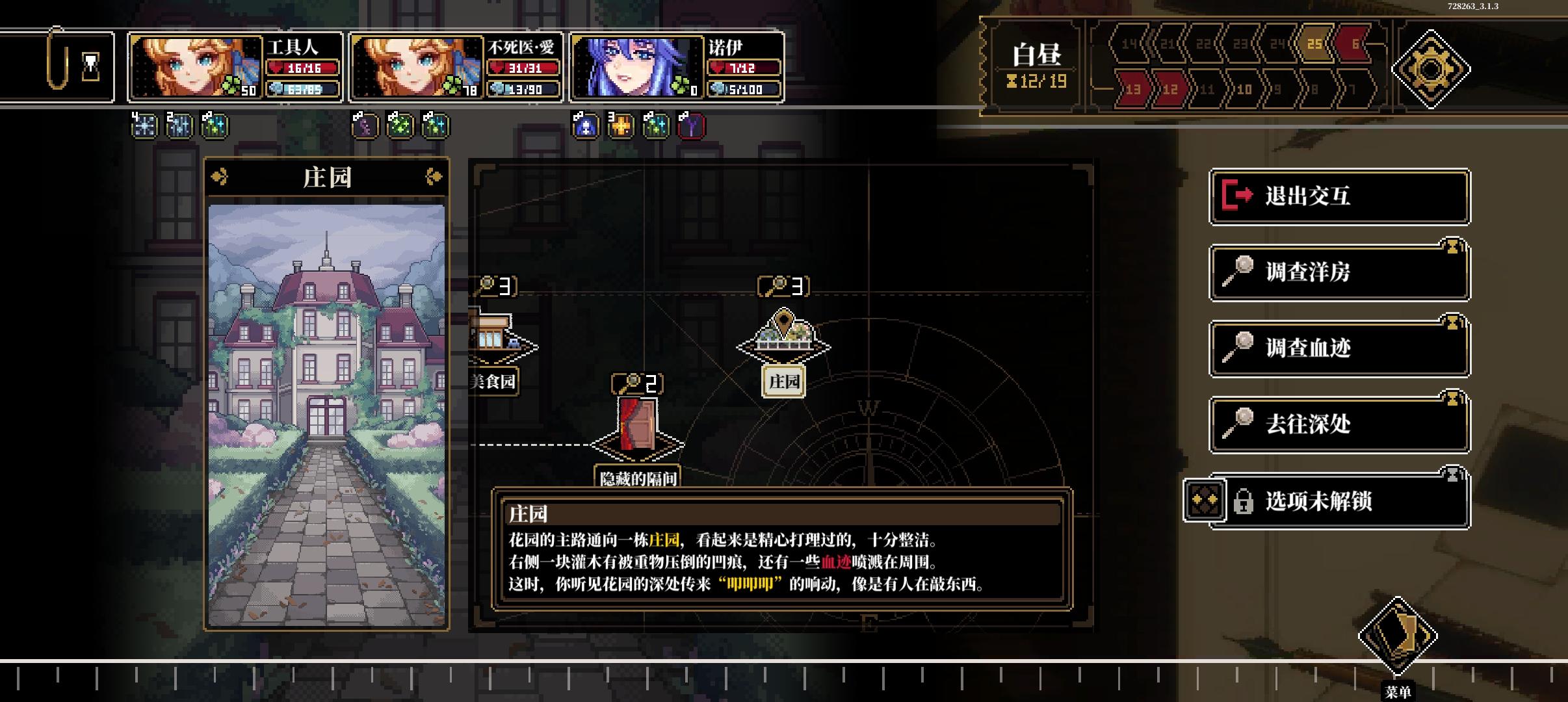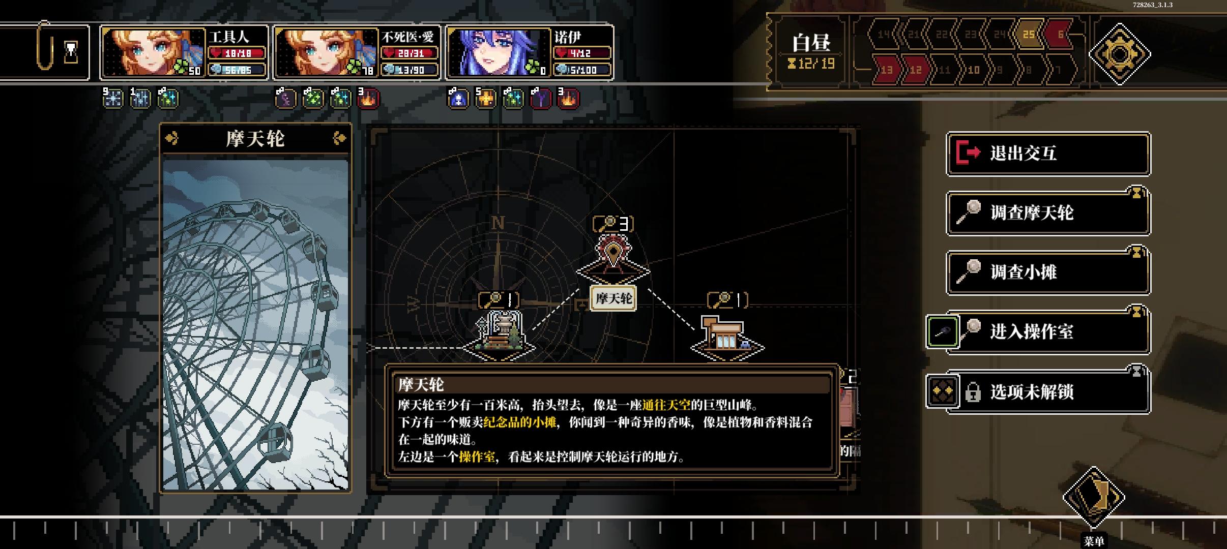 接着剩下三点行动力,移动去大门或恐怖屋,再去广场,这样来花掉进入黄昏,也可以用别的方式。只要保证进入黄昏时人在广场,方便后续路线