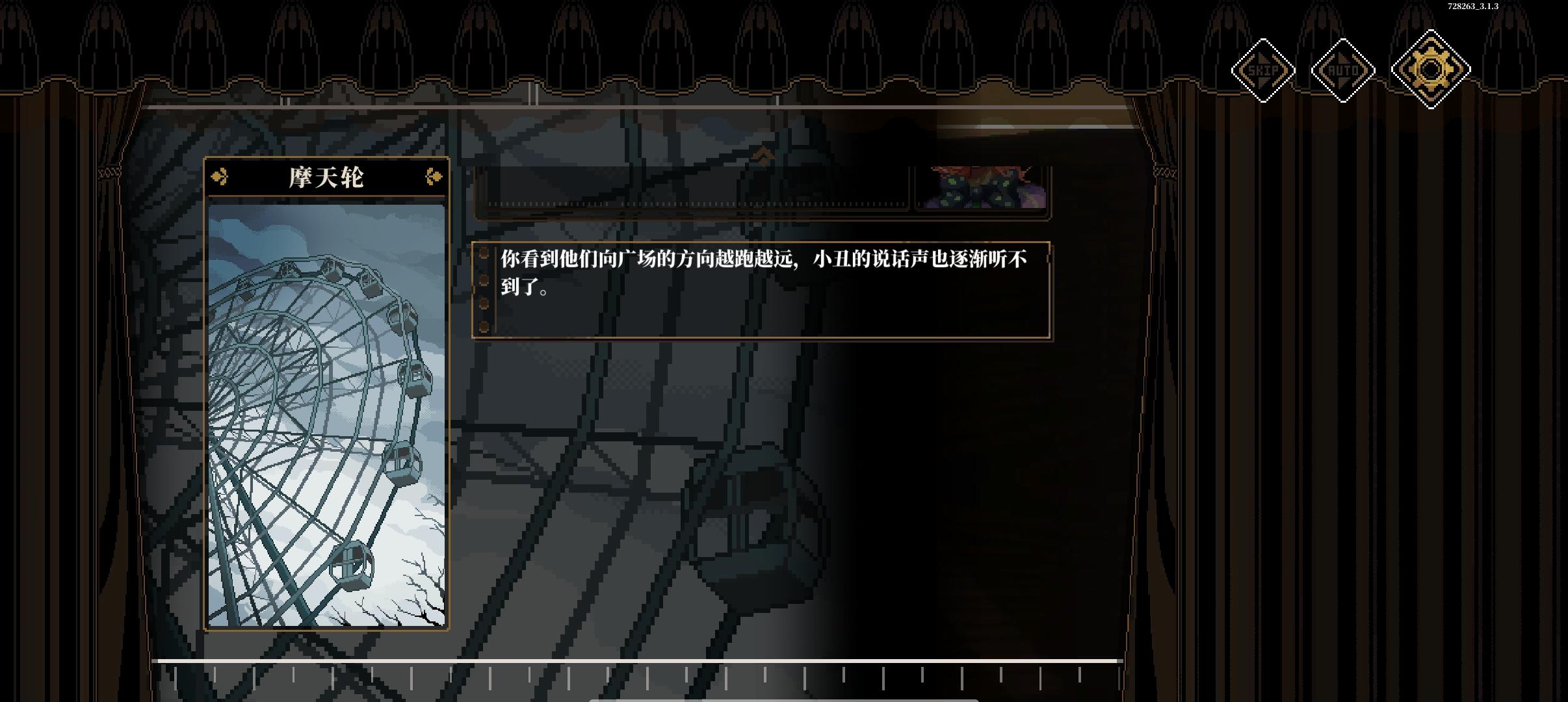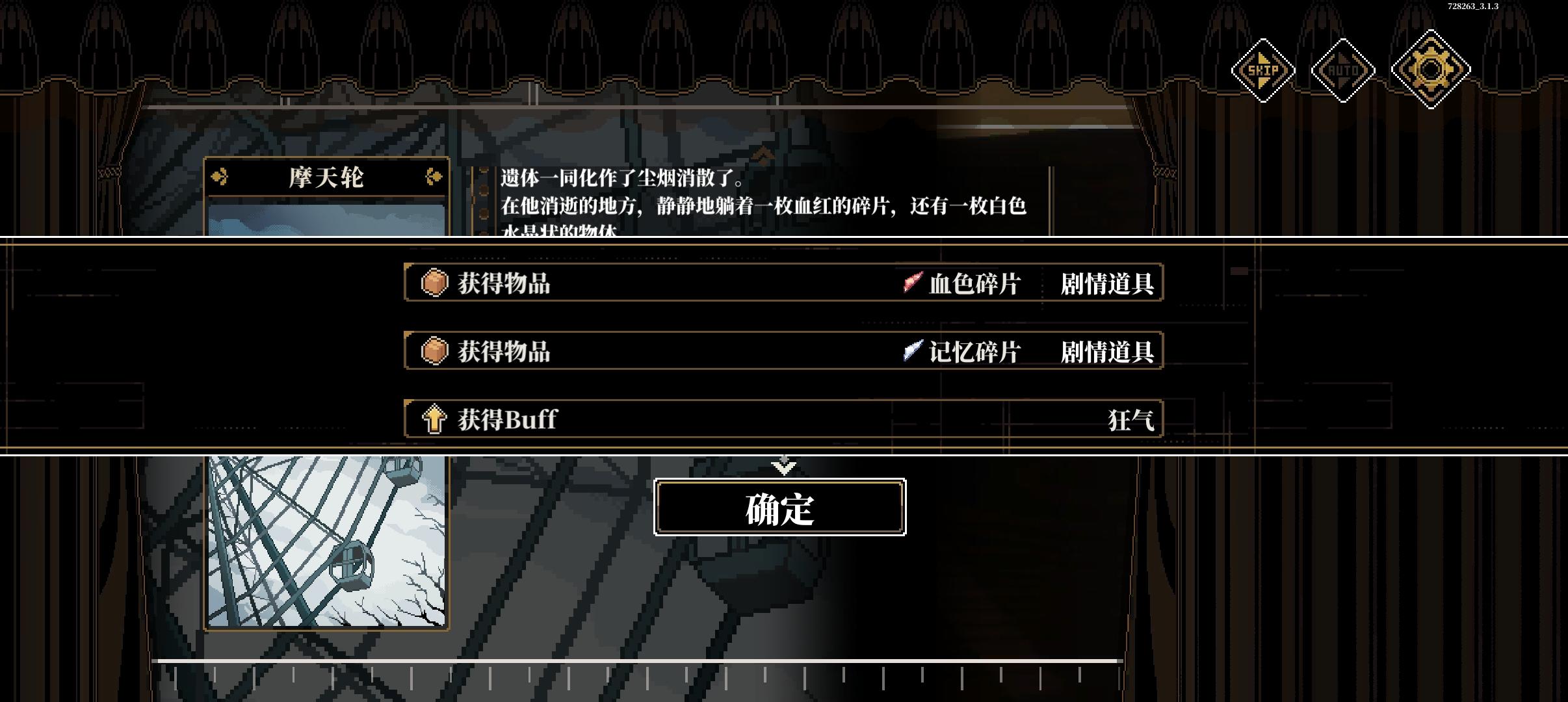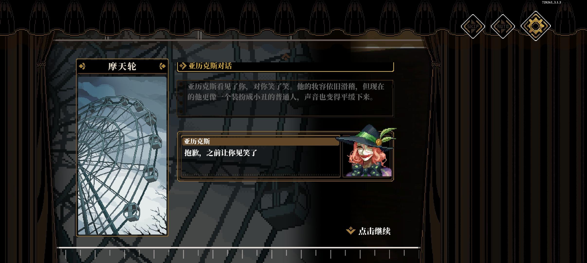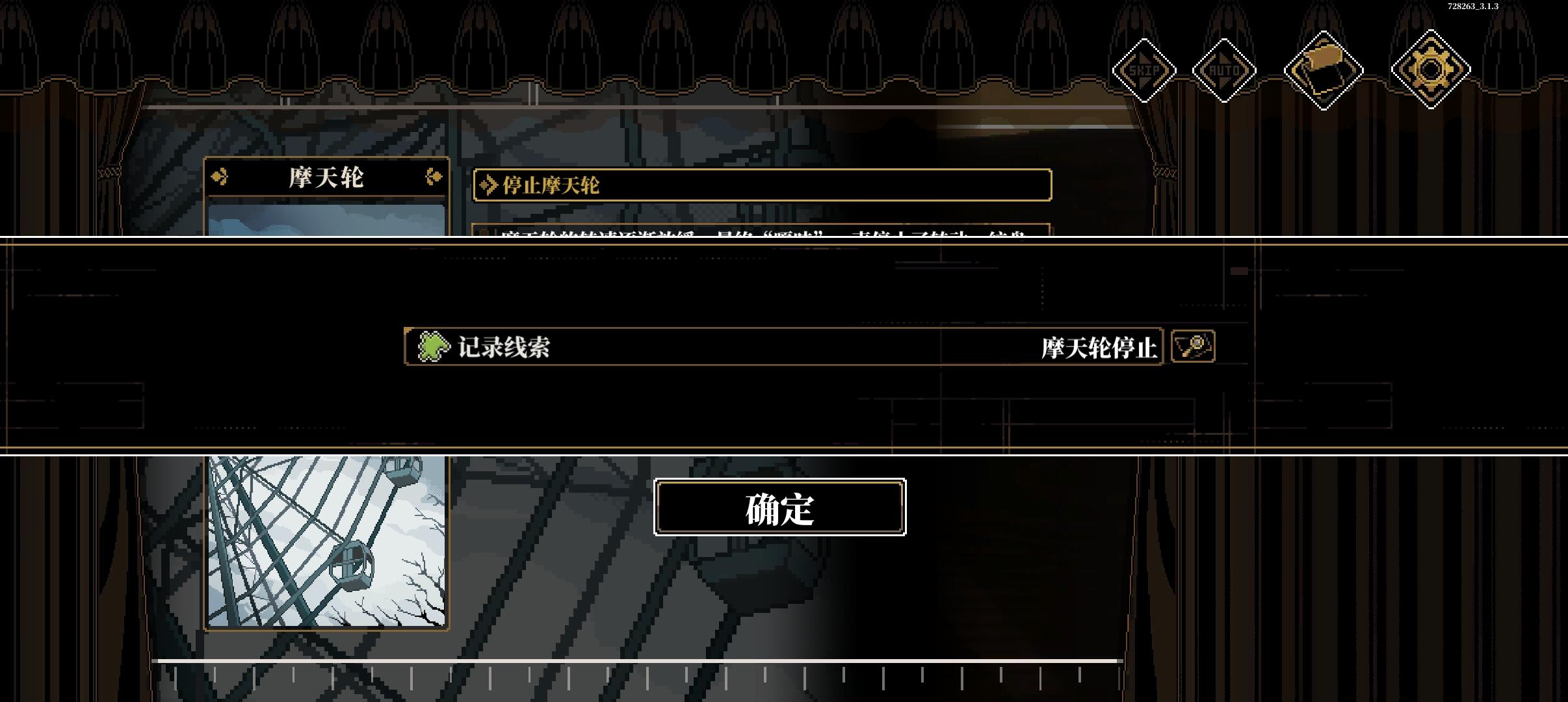 接着“去操作室”,“停止摩天轮”,就可以与小丑亚历克斯对话,拿到必要道具和真结局前置之一:强制微笑