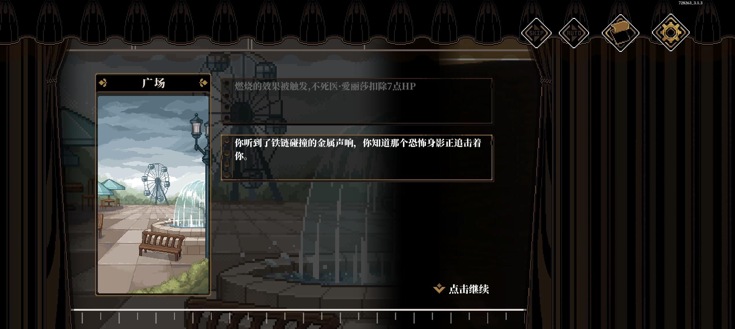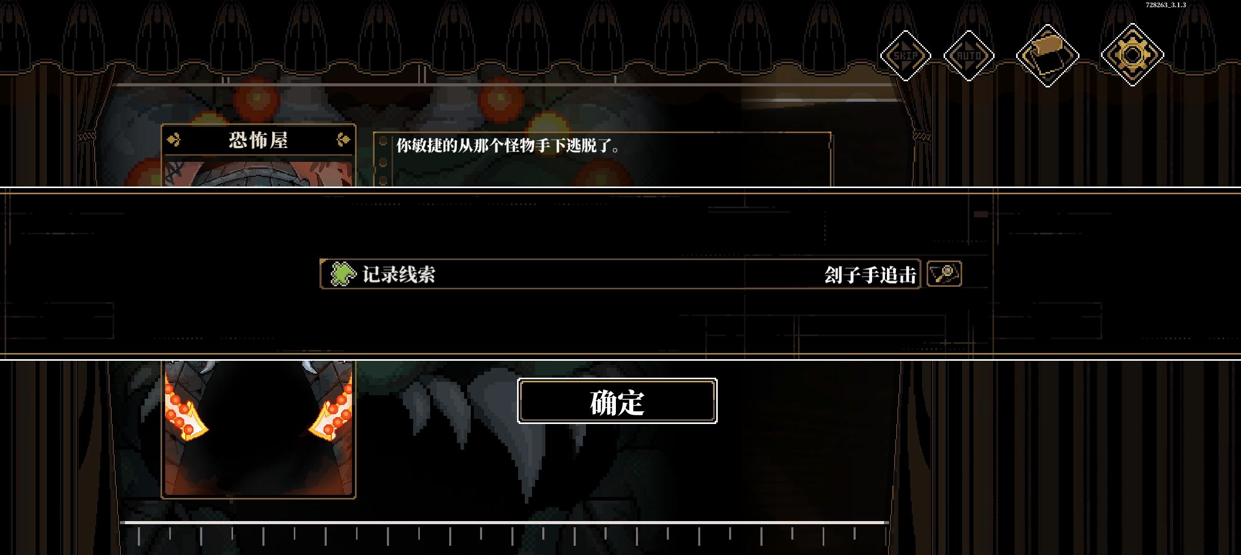 接着去恐怖屋,触发与刽子手的战斗,选择逃离,成功逃跑后会被追击,之后每去一个地方都要过是否触发战斗的检定