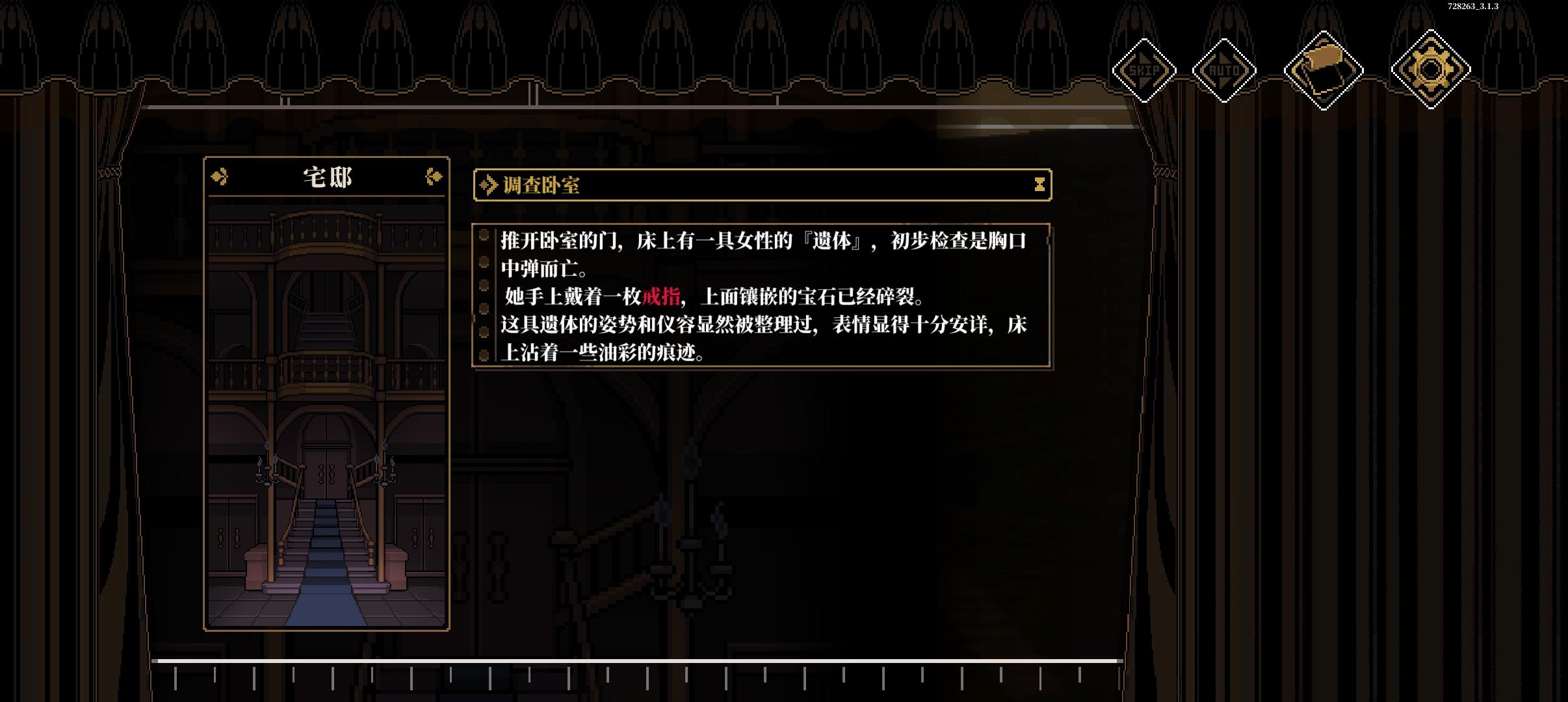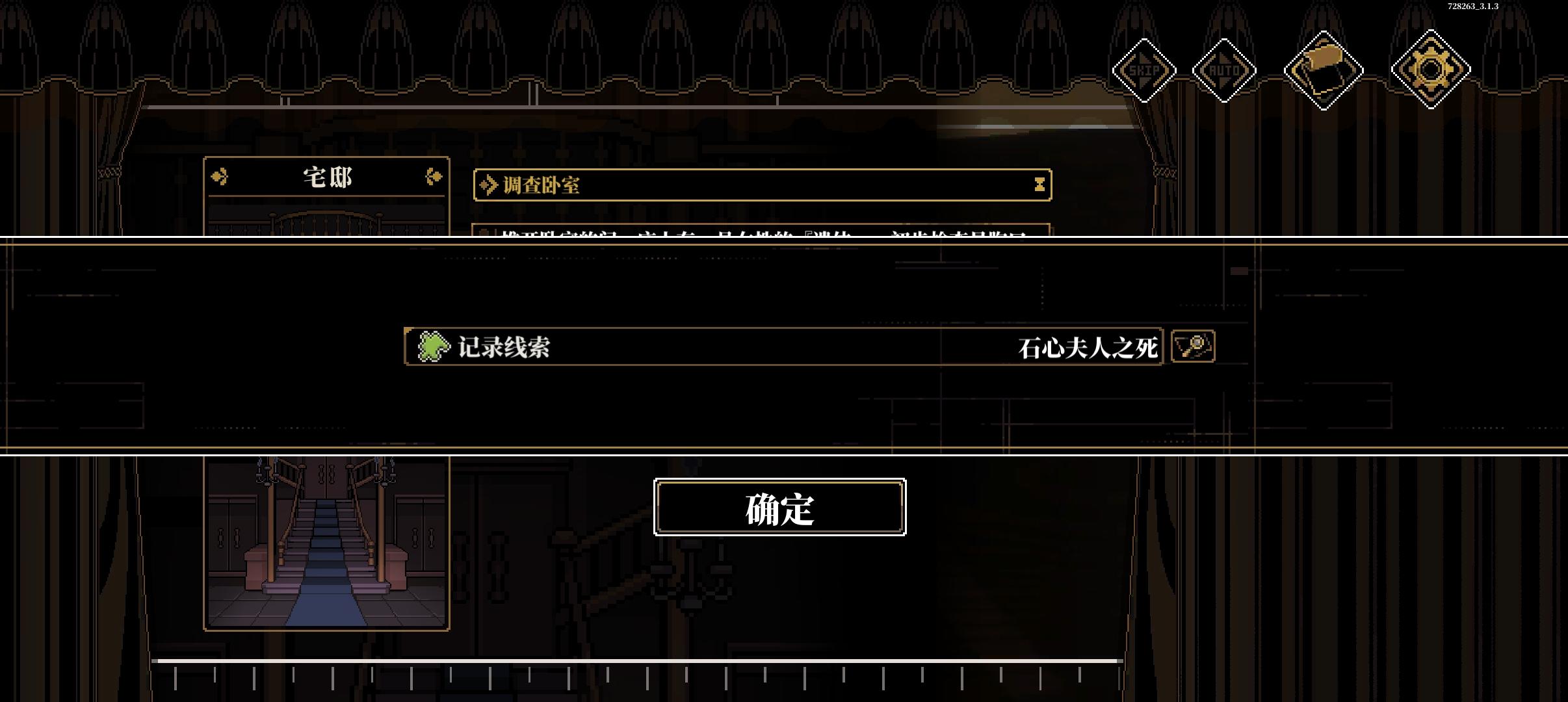 “调查洋房”,去宅邸点“探索场景”,“调查卧室”,拿到必要线索“石心夫人之死”