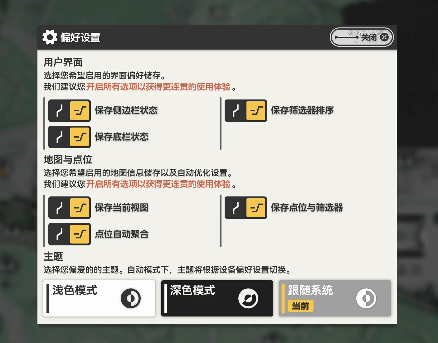 我们可以保存您的页面使用状态与进度——通常建议开启页面状态保存,这样在临时离开或刷新页面后也能无缝继续使用(例如,不小心刷新页面之后不需要重新展开侧边栏/重新选择点/重新找刚刚看到的点在哪里);如果您不希望启用该功能,也可以在设置中关闭。(图6)