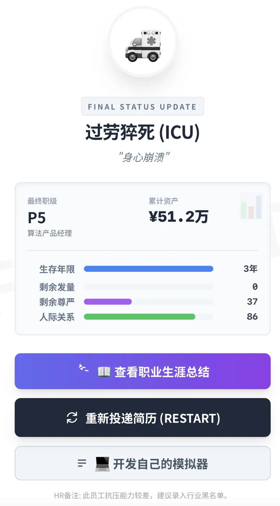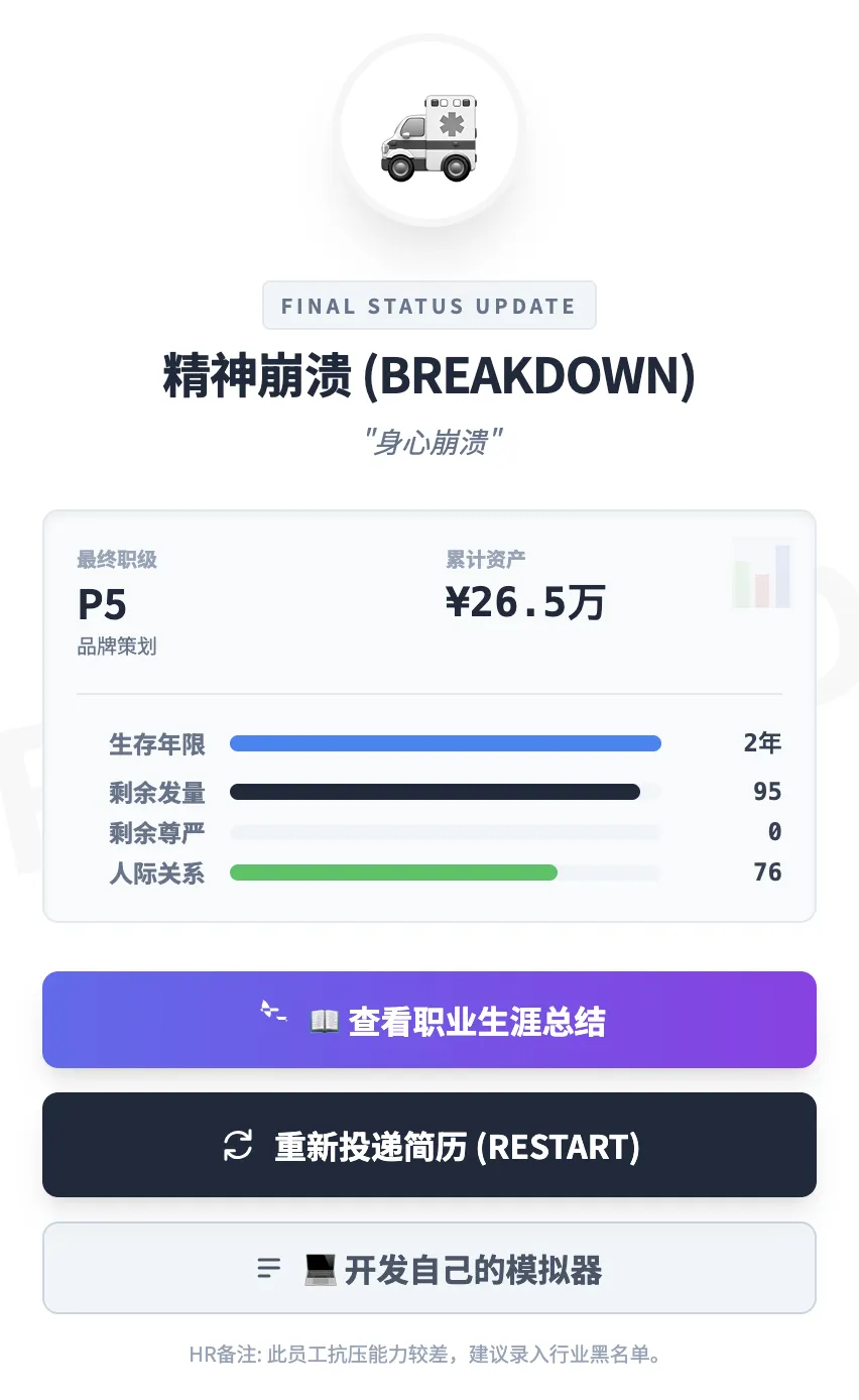 在身体和心灵的双重压力下,大家的两管血条也终于迎来了作用。如果只是绩效低,最多只是工作的慢性死亡。但若发量和尊严过低,就会直接ICU和宛平南路二选一,走向坏结局。