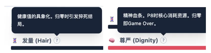 再比如这款游戏里没有力智敏,取而代之的是“发量”和“尊严”。一管是血条,另一管,也是血条。
