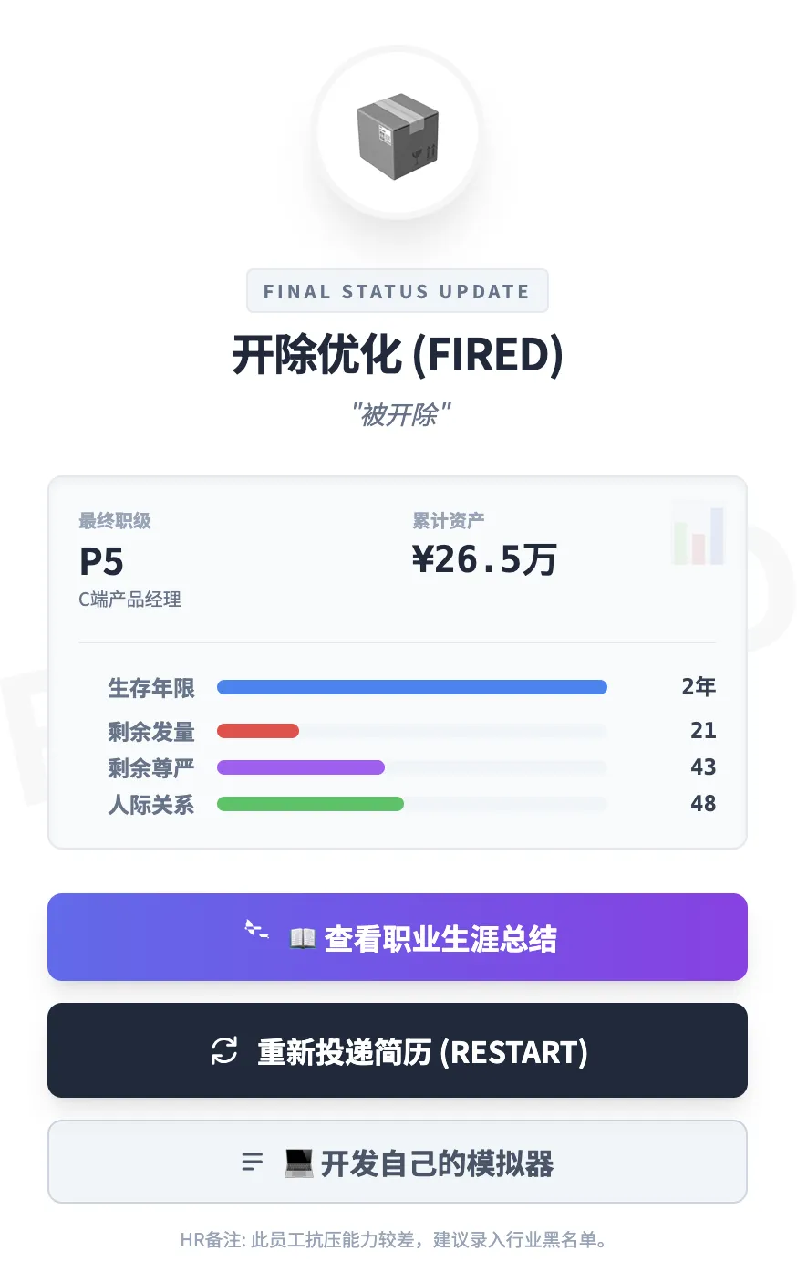 除了血条空掉或者过了年龄会被“优化”外,自身的“风险”过高也会引发失败,并不是说你真的窃取了公司机密什么的,只是有些雷虽然不是你埋的,却刚好轮到了你来踩。
