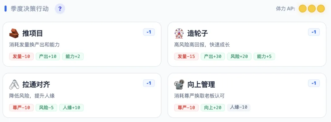 游戏的玩法并不复杂。你的人生被切割成了一个个“季度”,每个季度只有三次行动机会。无论是埋头做产品、卑微地向上管理,还是偶尔带薪摸鱼,每一次选择都会微妙地推动一点点人生轨迹。