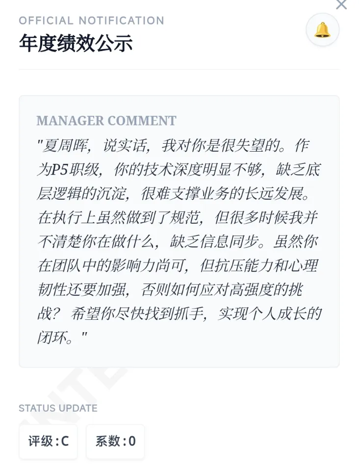 而作为初入互联网大厂的崭新赛级牛马,你的目标则是从谁都能踩一脚的小P5,一路打拼到P10级别的大高管,办公室花名册之上,万人之下;