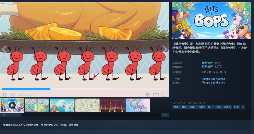 在节奏游戏领域,《节奏天国》系列一直是许多玩家心中的经典之作。而由澳大利亚独立工作室 Tempo Lab Games 开发的《啵点节奏》(Bits & Bops),自 2025 年 12 月 9 日登陆 Steam 平台以来,凭借其清新可爱的手绘风格和创意十足的节奏玩法,被不少玩家称为 "《节奏天国》精神续作"。这款看似简单的节奏小游戏合集,却在有限的框架内创造出了令人惊喜的深度和乐趣。《啵点节奏》的核心概念相当直接 —— 将日常生活中的各种动作与音乐节奏完美结合。