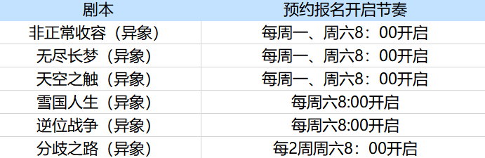 1、不带异象标签的「天空之触」、「无尽长梦」、「雪国人生」剧本会在每月1日8:00 进行开启、「非正常收容」剧本会在每月1日、15日8点开启、「分歧之路」剧本会每2周周六8:00开启。