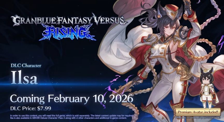 Cygames与Arc System Works联合官宣,《碧蓝幻想 Versus:崛起》第二季角色通行证压轴付费DLC角色 —— 伊尔莎,将于 2 月 10 日正式加入游戏,标志着该季更新内容完整揭晓。