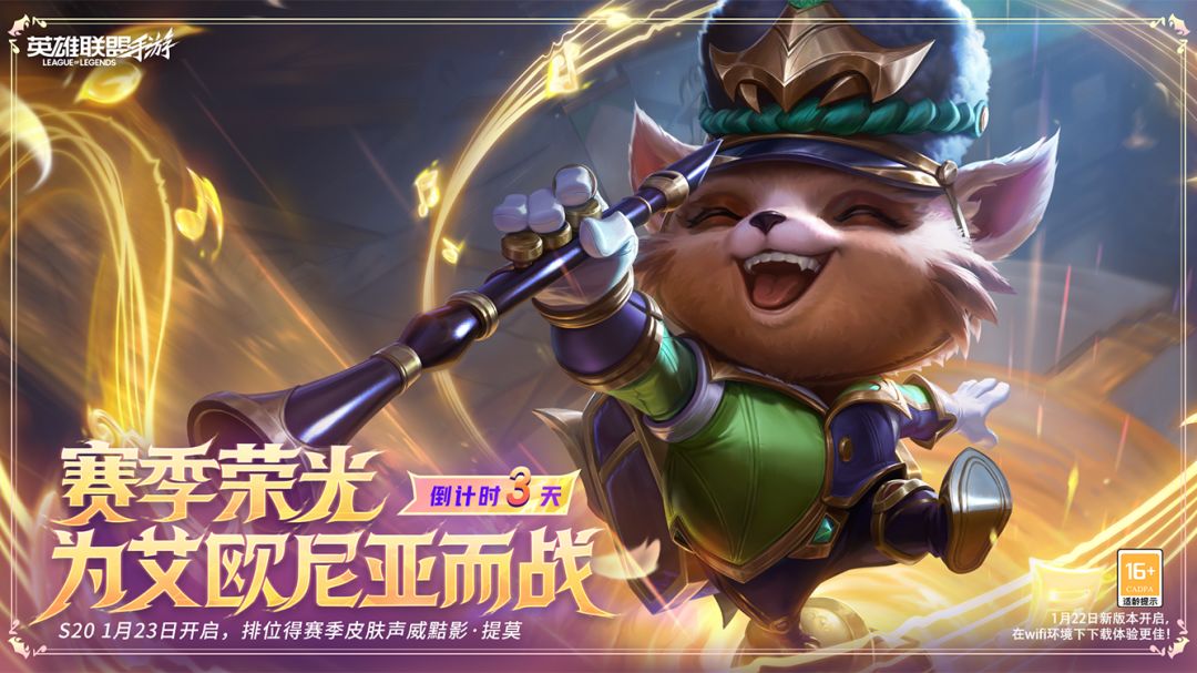 全新7.0版本倒计时3天!S20新赛季将于1月23日8:00开启,参与排位得赛季皮肤-声威黠影 提莫。截止至1月21日23:59,召唤师完成倒计时分享任务,共计可领取龙魂水晶*500奖励~