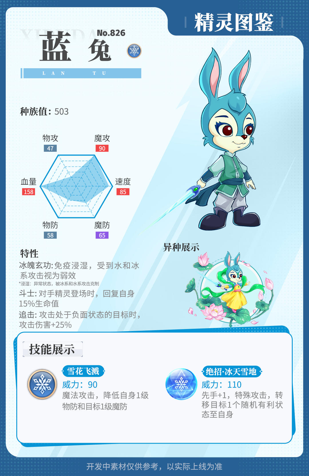 1月17日发布的精灵百科中,蓝兔的雷达图以及技能——【冰封禁锢】技能威力有误,请小西普们以更正后的信息为准: