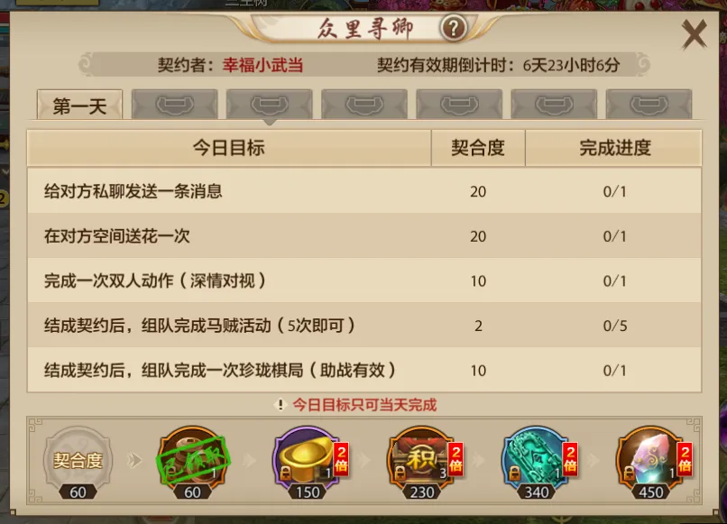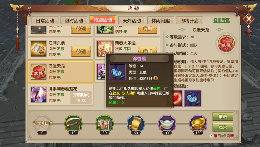在此期间,完成众里寻卿契约且契约值达到450还可得限定双人动作道具-锦香囊(使用后可永久解锁双人动作-爱你,之前已获得的少侠可兑换大量铜钱)。