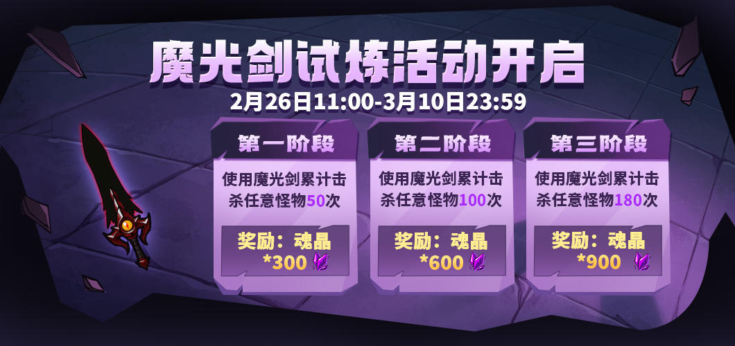 第一阶段:使用魔光剑击杀任意怪物50次,奖励:奖励魂晶*300;