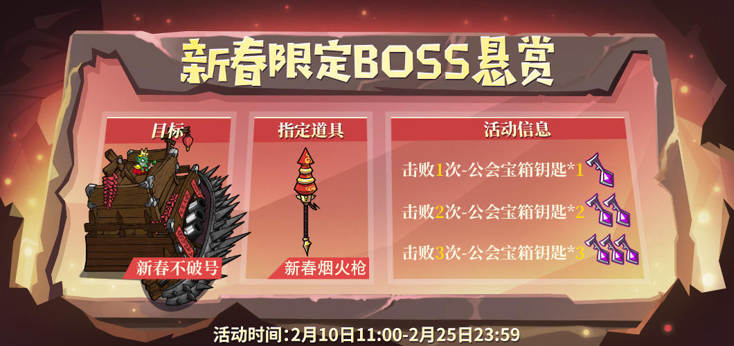 第三阶段:使用新春烟火枪累计击败新春不破号3次,奖励:公会宝箱钥匙*3。