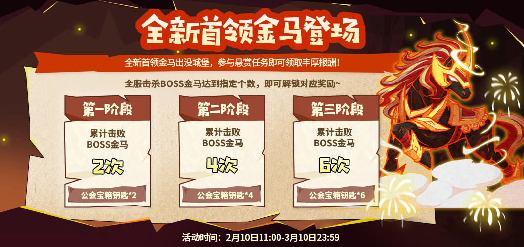 第一阶段:累计击败BOSS金马2次,奖励:公会宝箱钥匙*2;