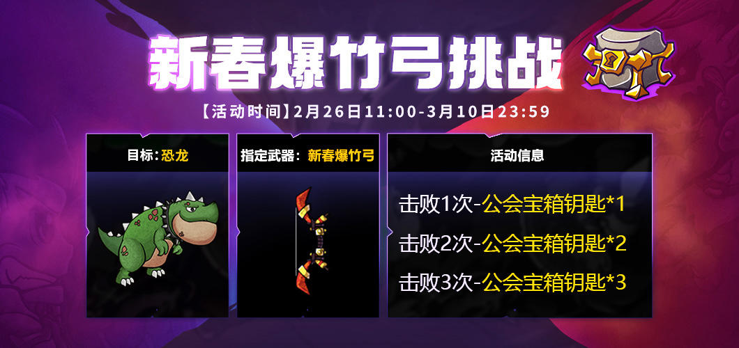 第三阶段:使用新春爆竹弓累计击败恐龙3次,奖励:公会宝箱钥匙*3: