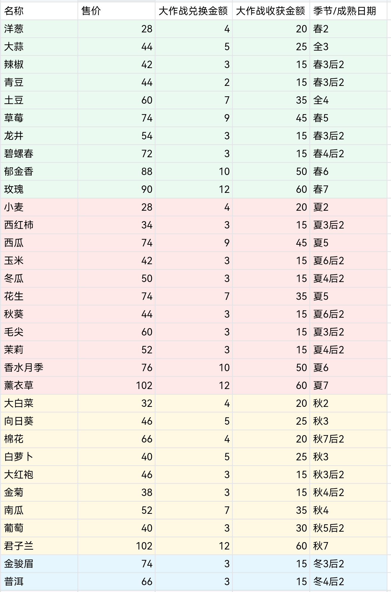 作物售价/成熟日期/种植大作战积分 整理26.1.19